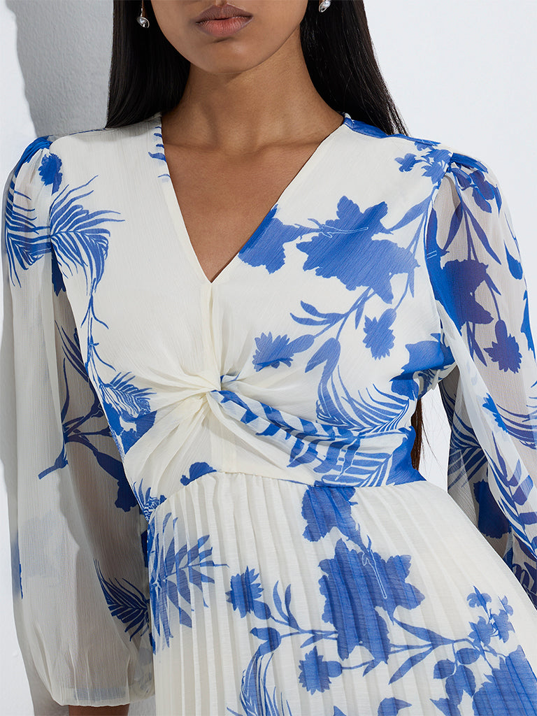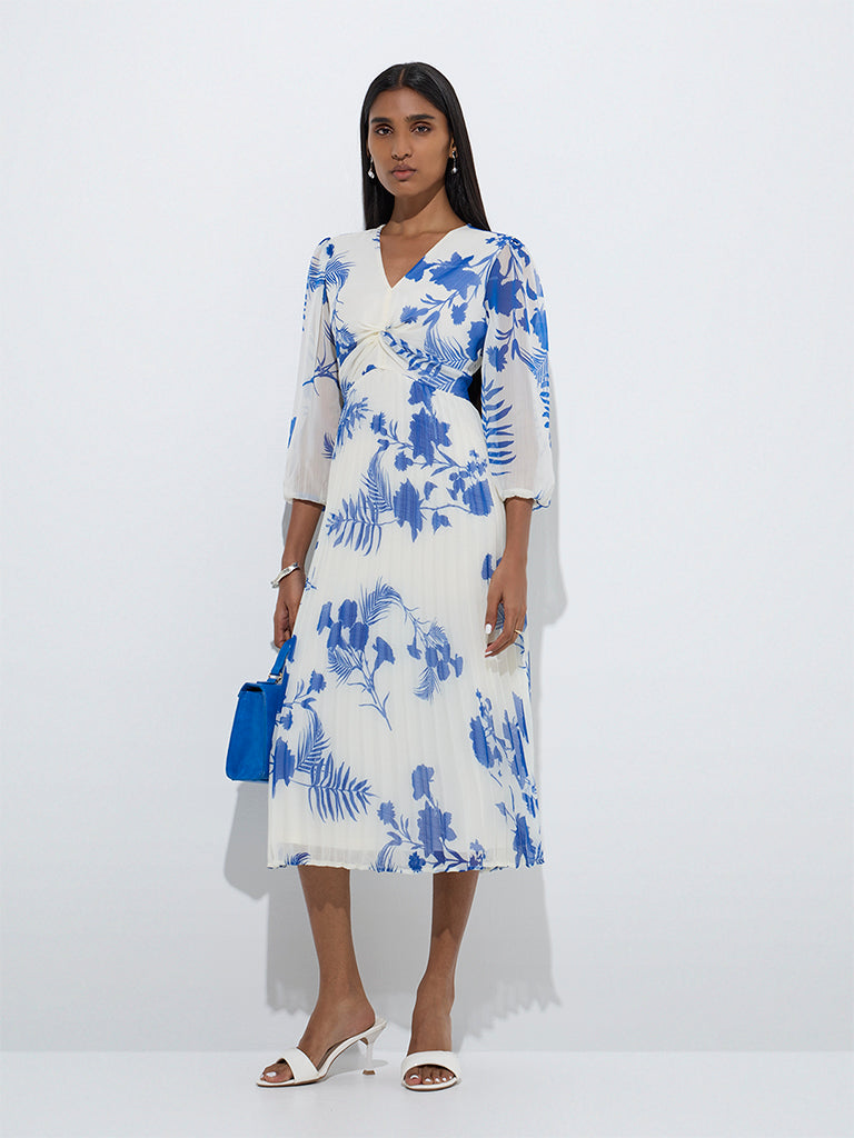Bring a breezy elegance to your wardrobe with this white A-line dress from Wardrobe. adorned with a serene blue botanical print. Crafted from quality fabric. it features a knot-designed bodice. a flattering V-neckline. and three-quarter sleeves. Accordion pleats at the bottom add graceful movement to this effortlessly chic silhouette.