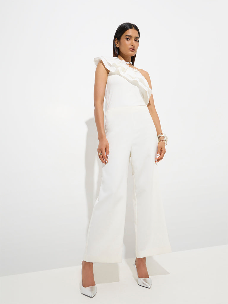 Wardrobe reimagines occasion wear with this white one-shoulder top. elevated by soft ruffle detailing that lends graceful movement. Cut from a rich cotton-blend fabric. it brings together ease and sophistication.