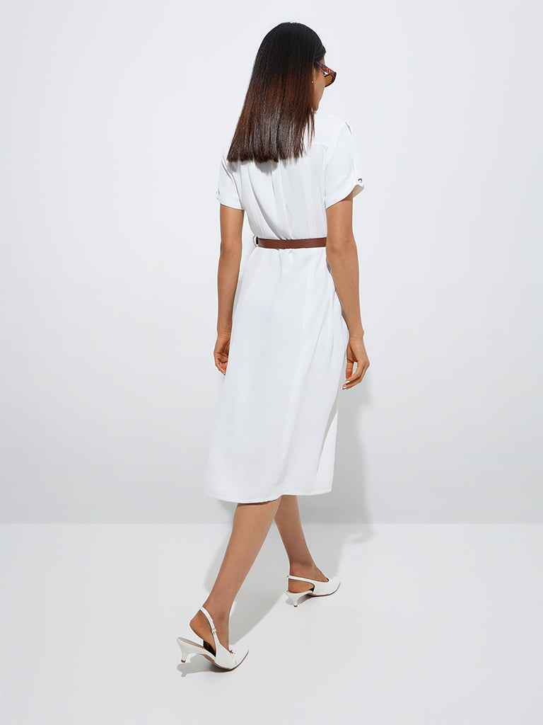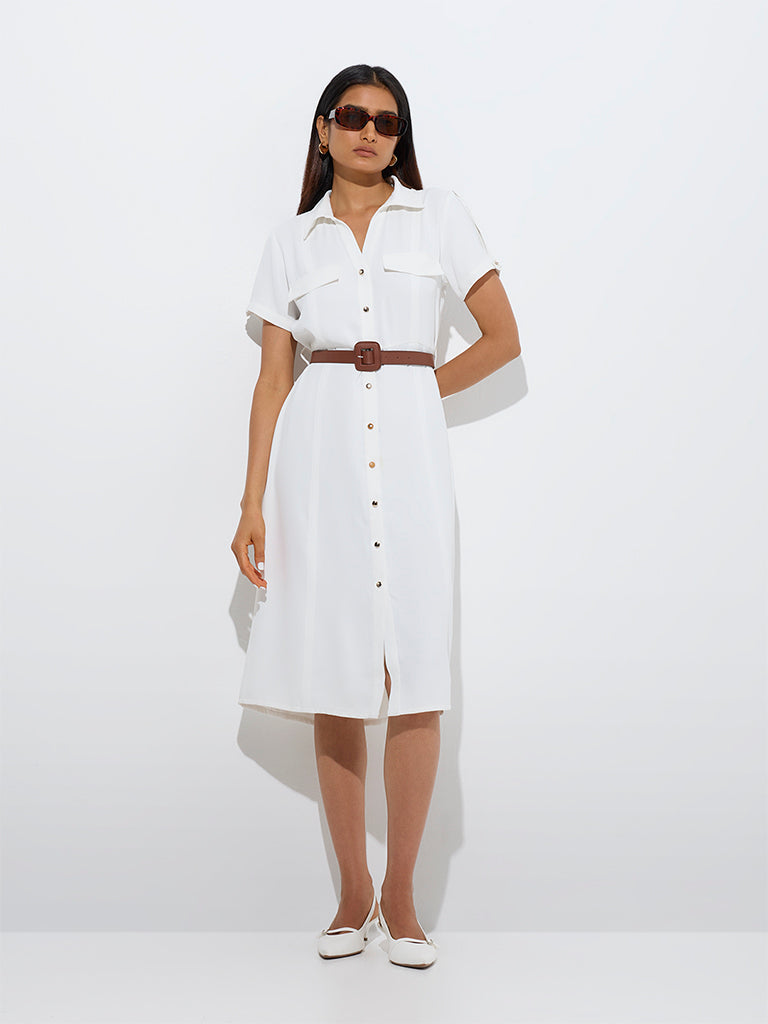 This white shirt dress from Wardrobe is made from a lightweight fabric and styled with a spread collar that flows into a button placket. half sleeves lend a breezy touch. while imitation front flap pockets add subtle detail. A detachable belt cinches the waist for a defined silhouette.