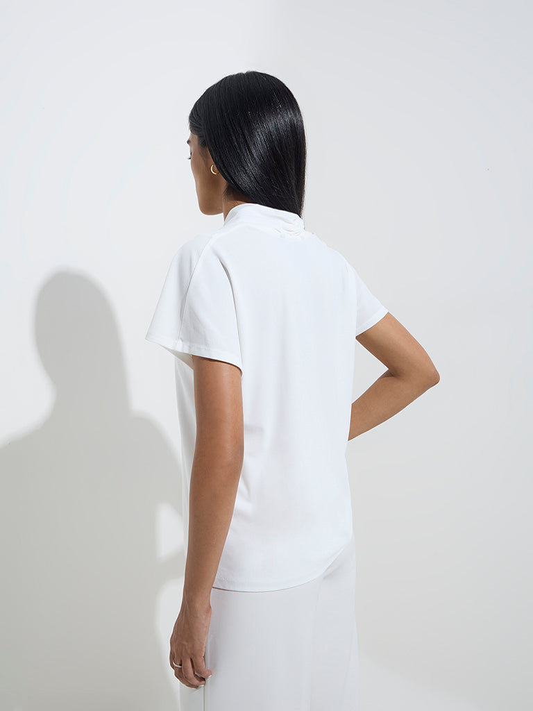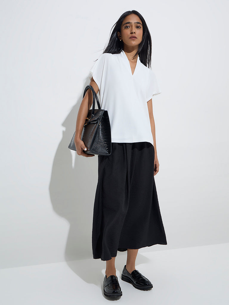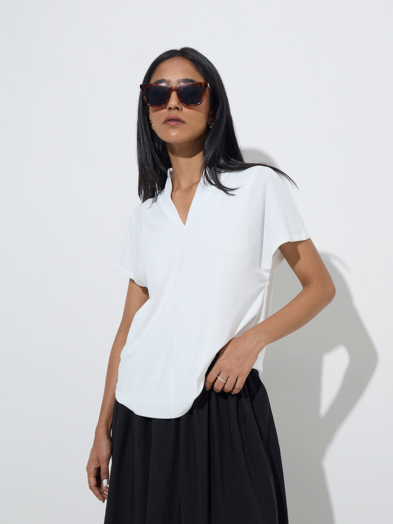 Wardrobe launches this solid white blouse crafted with sumptuous fabric. It is structured with a V-neck and dolman sleeves.