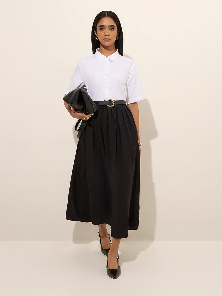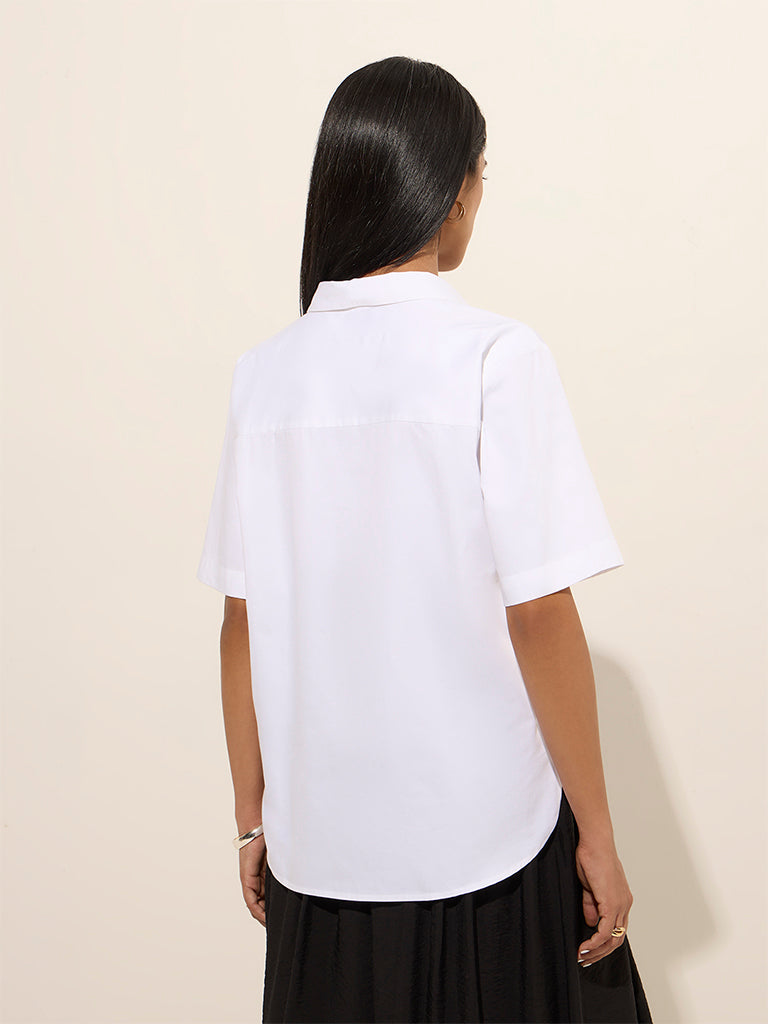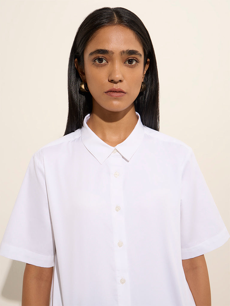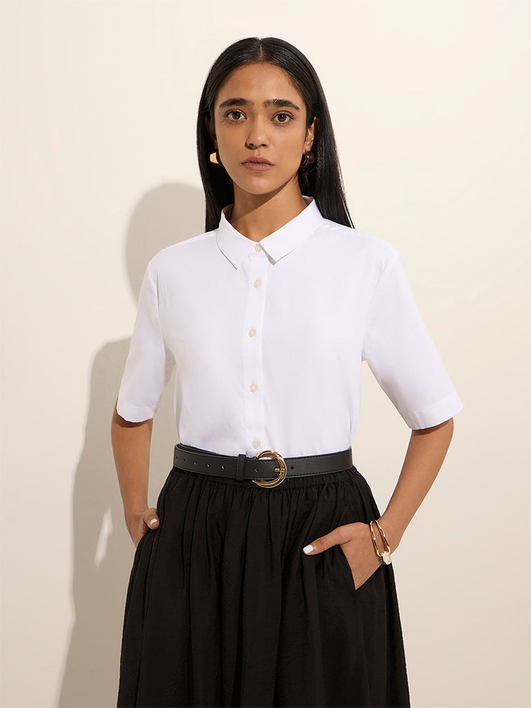 This white solid shirt by Wardrobed in built with pure cotton. It is structured with a shirt collar leading to a button down style and half sleeves.