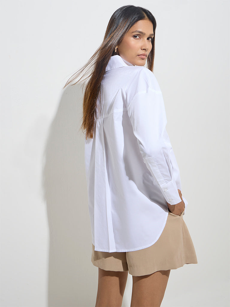 Wardrobe presents this white solid shirt. tailored from pure cotton for breathable comfort. Designed with a smart collar extending to a button placket and full sleeves. it offers a crisp. structured look perfect for smart-casual occasions.