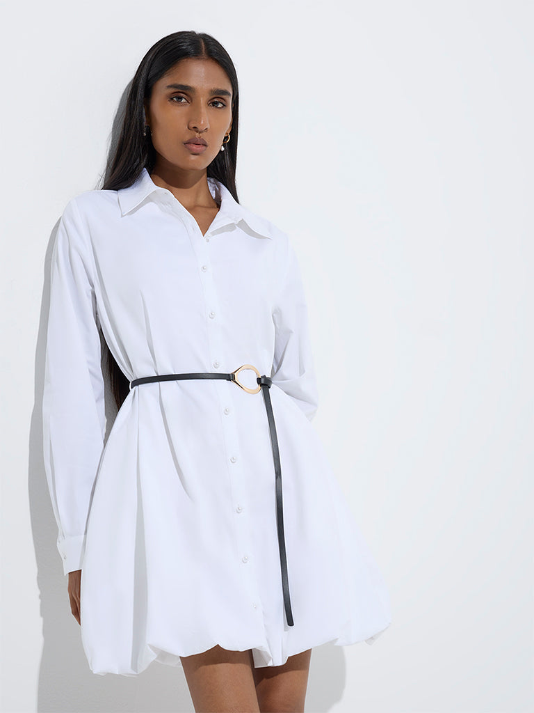 Wardrobe White Solid Cotton Shirt Dress with Belt
