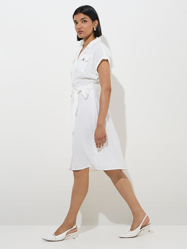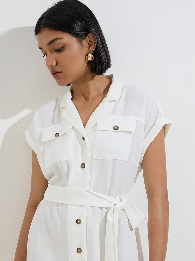 Wardrobe White Solid Cotton Shirt Dress with Belt