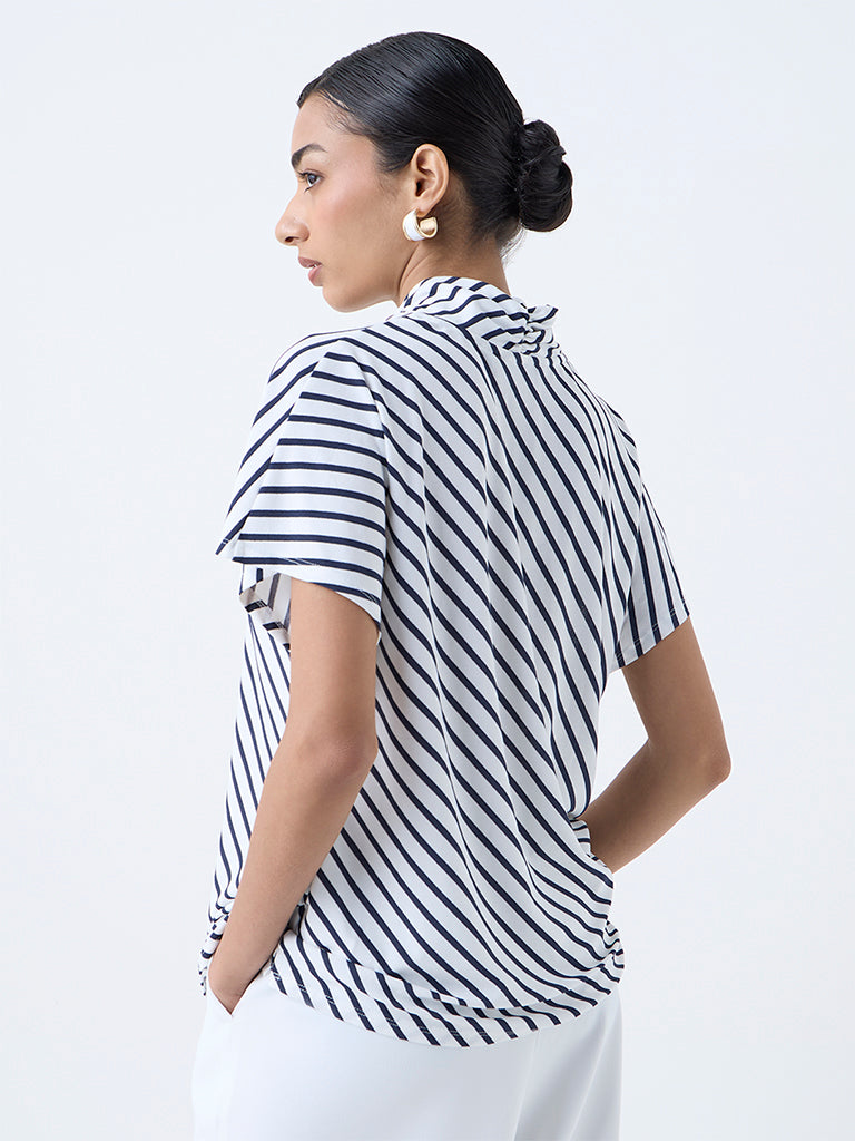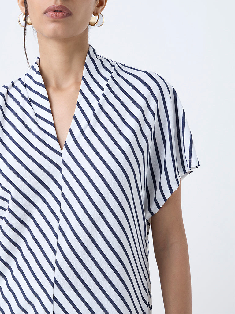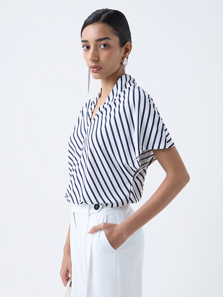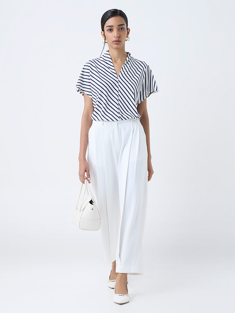 This white blouse from Wardrobe is defined by stripes in a contrasting hue that lend it a crisp. contemporary edge. Designed with a V-neckline and dolman sleeves finished with an upturned hem. it offers an effortless balance of polish and ease.