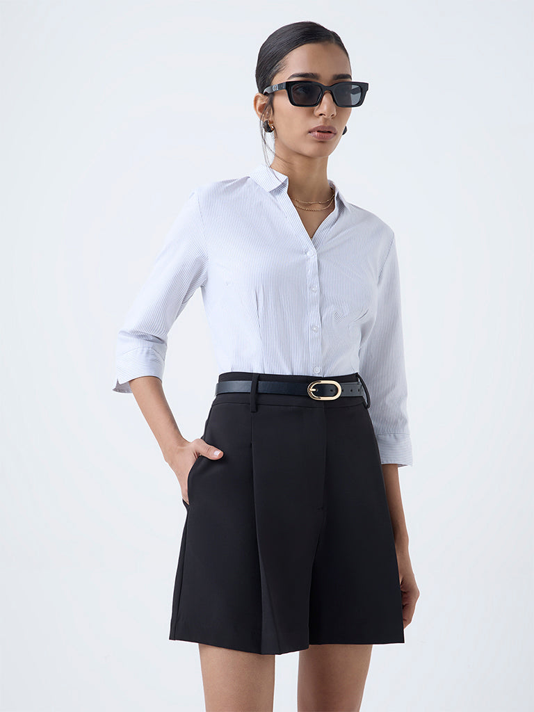 Wardrobe launches this white striped shirt. crafted to balance timeless style with comfort. The V-neck collar and neat button placket highlight its structured appeal. while 3/4 sleeves add a relaxed edge. Cut from a lightweight fabric. it delivers breathable ease. making it an effortless go-to for everyday dressing.
