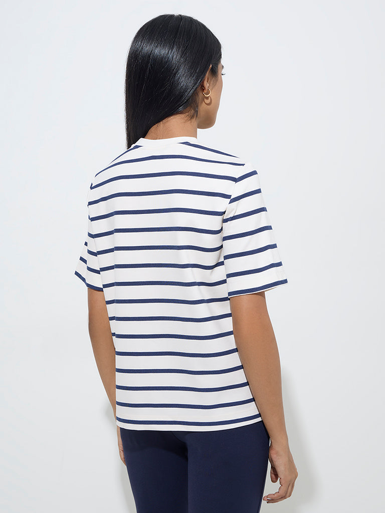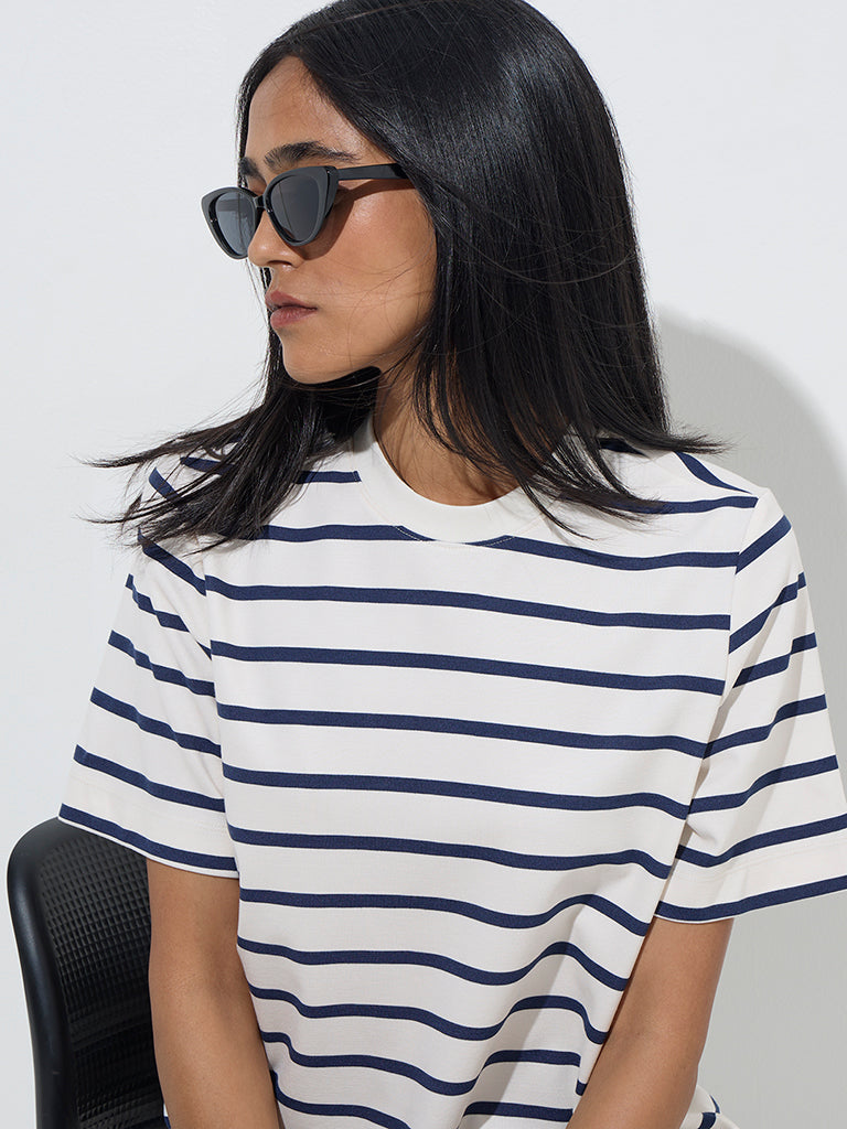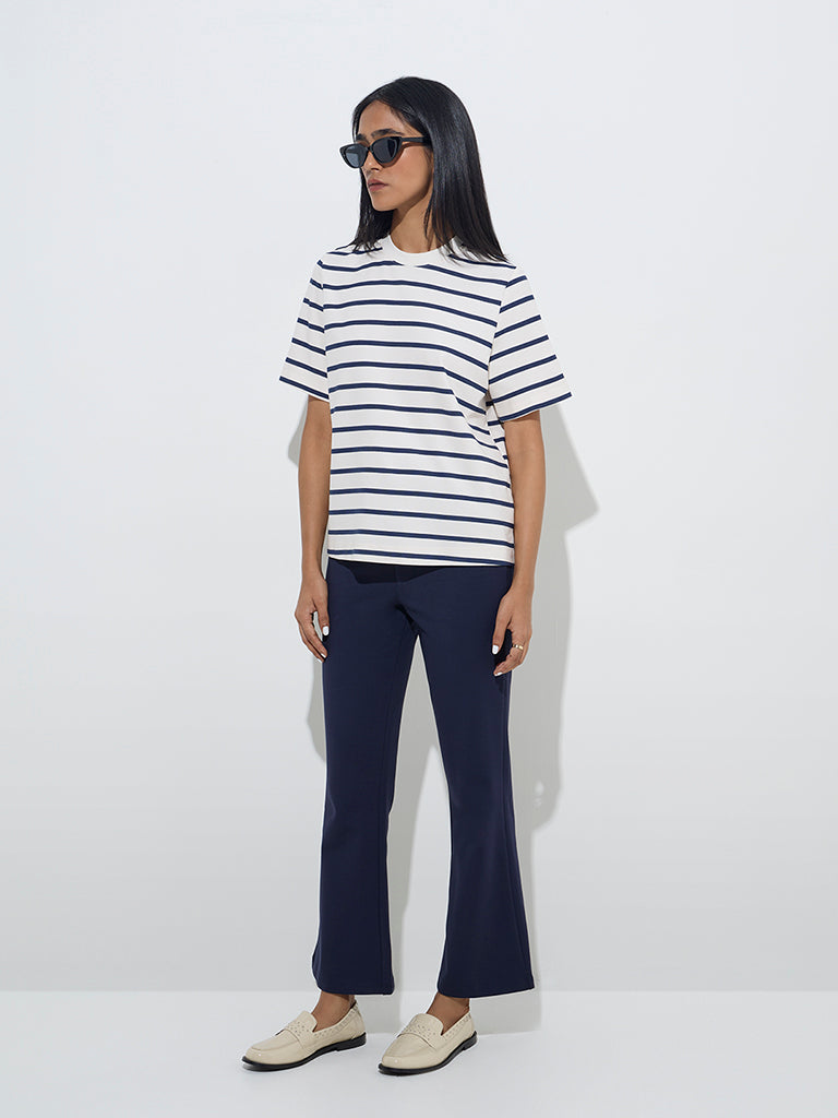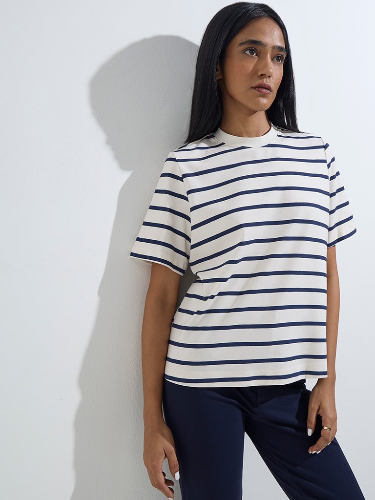 Crafted from luxurious fabric. this white top by Wardrobe is ideal for a not-so hectic workday. Adorned with navy blue stripes. it carries a round neck and short sleeves.