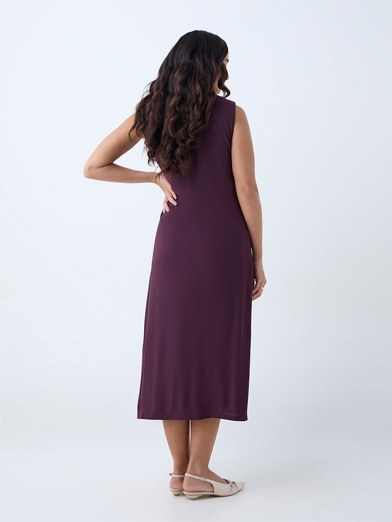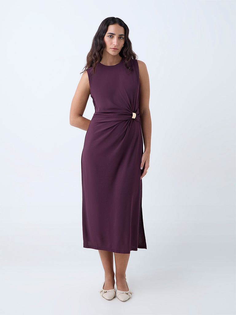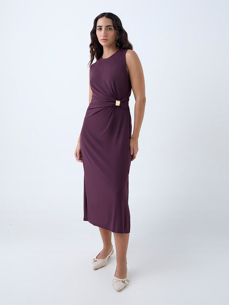 This wine dress from Wardrobe is a refined statement in modern elegance. Designed with artful ruched detailing along the side. it’s finished with gold-toned hardware that lends just the right touch of understated glam. The round neck and sleeveless cut create a streamlined silhouette. while the premium fabric sculpts for a flattering fit that moves effortlessly from desk to dinner.