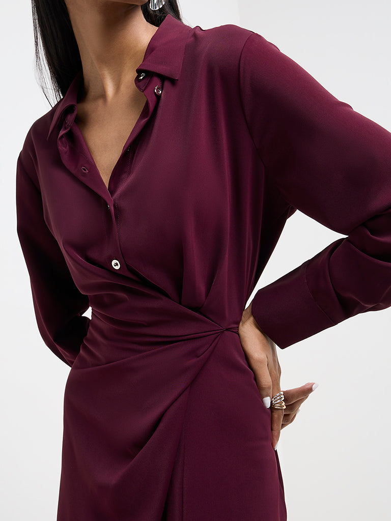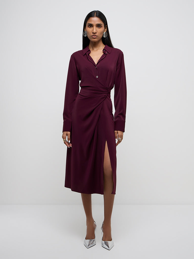 This wine shirtdress from Wardrobe flaunts a wrap design at the waist. Made from a lightweight fabric. it is complete with a classic collar that extends to a button placket and full sleeves.