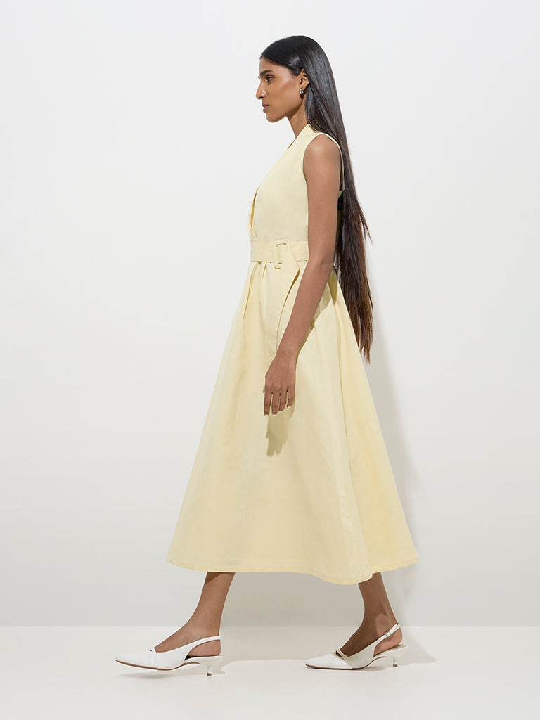 Shaped in an A-line silhouette. this yellow dress from Wardrobe brings a refreshing charm to your daywear. Milled from a lightweight fabric. it features a V-neck and a sleeveless profile for a breezy feel. The detachable belt cinches the waist for a flattering fit.