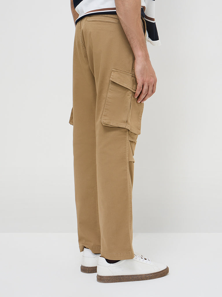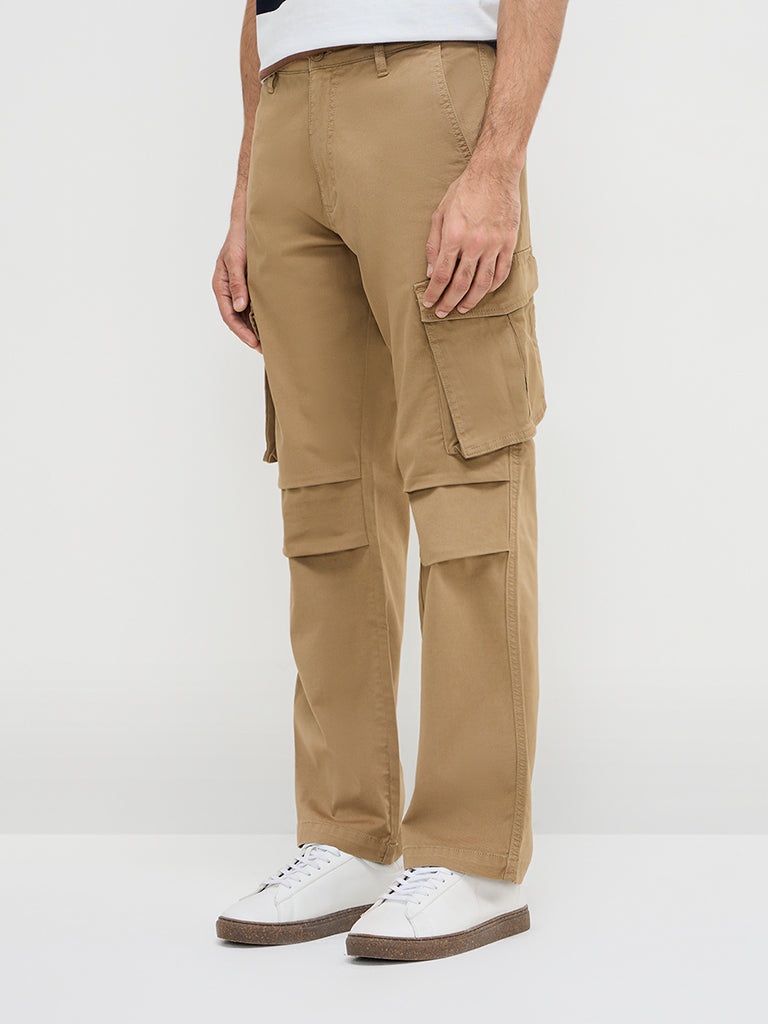WES Casuals Beige Cargo-Style Relaxed-Fit Mid-Rise Cotton-Blend Chinos