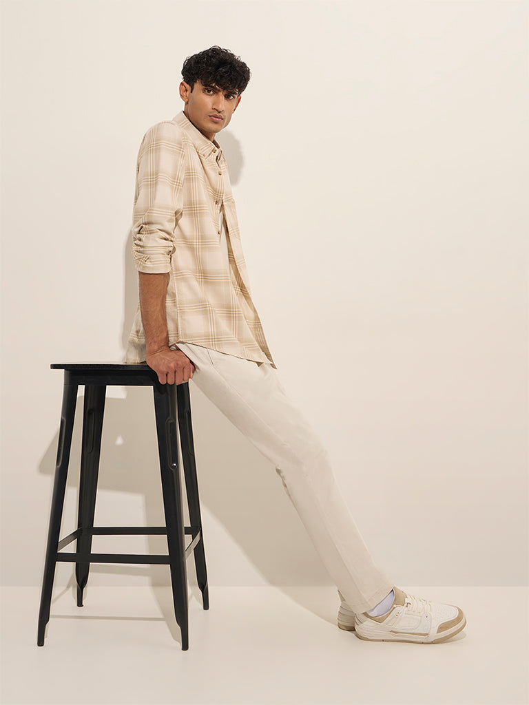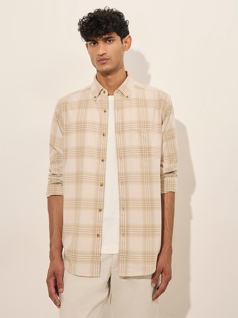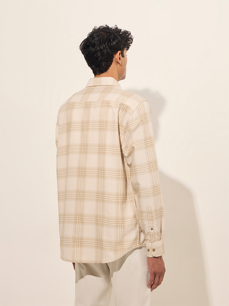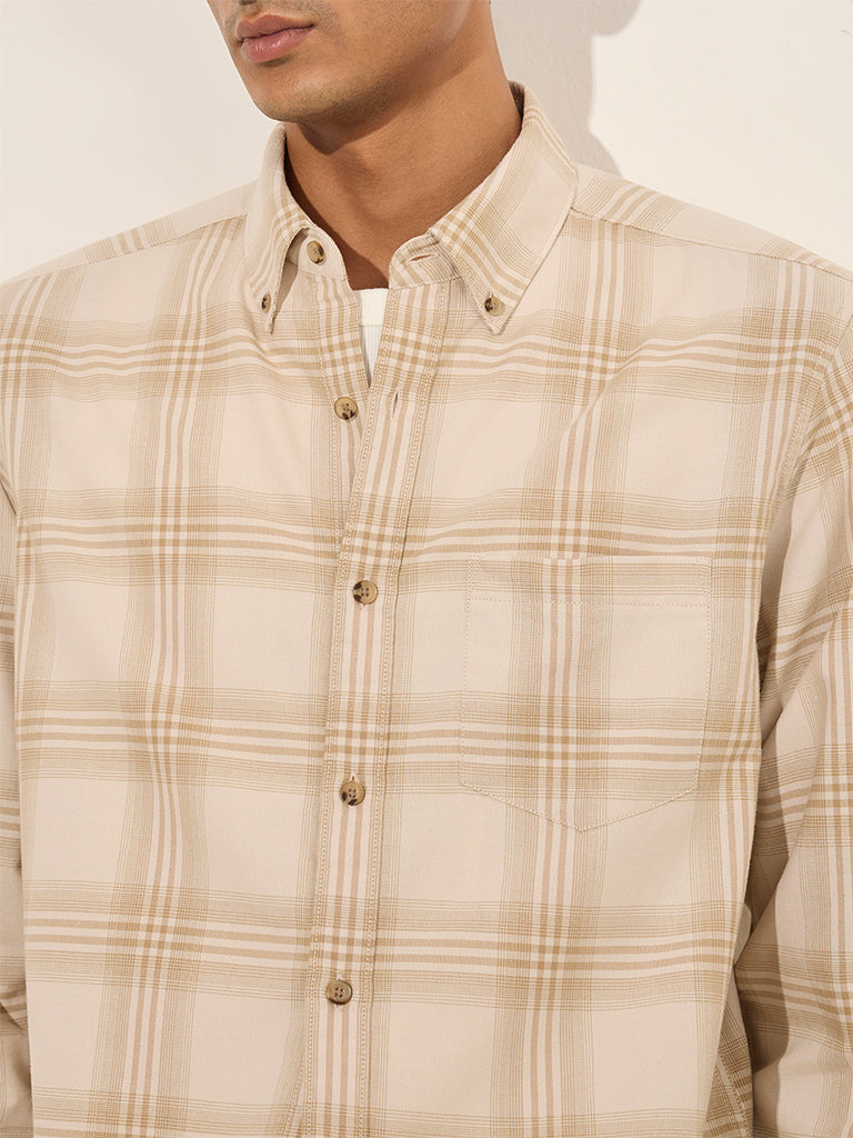 WES Casuals Beige Checks Printed Relaxed-Fit Cotton Shirt