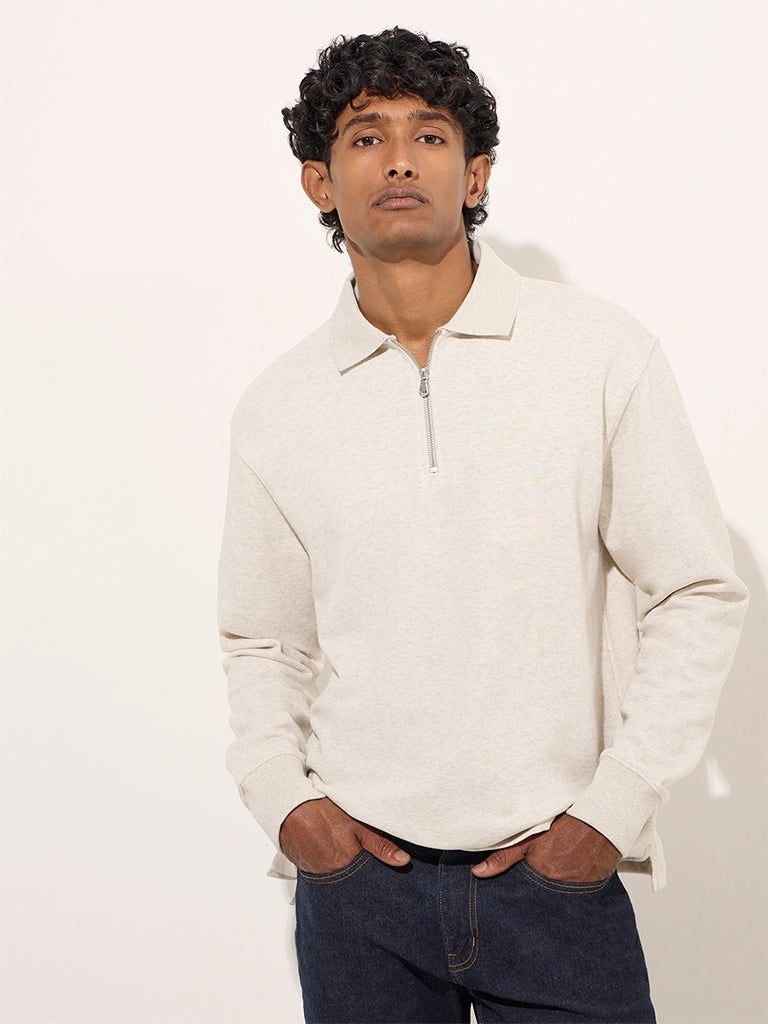 WES Casuals launches this beige sweatshirt crafted from a cotton-blend fabric for everyday comfort. Designed with a relaxed fit. it features a spread collar and a zipper placket for a stylish touch. along with full sleeves for added warmth and versatility.