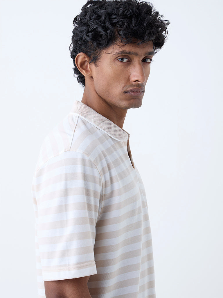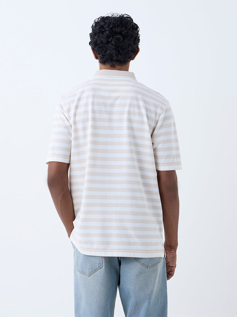 This beige polo t-shirt from WES Casuals is a versatile pick for off-duty days. Carved in a relaxed contour. it features a polo collar and short sleeves that offer all-day comfort. The stripe pattern adds a laid-back charm. making it easy to pair with everything from jeans to shorts for a relaxed look.