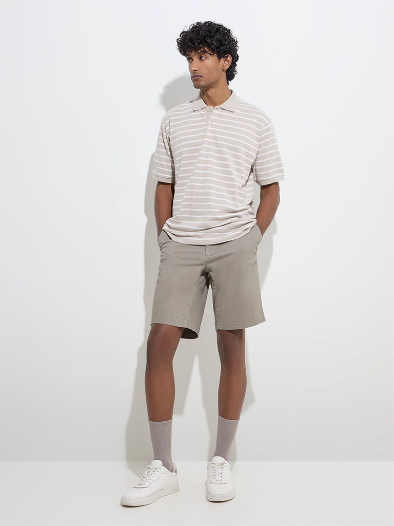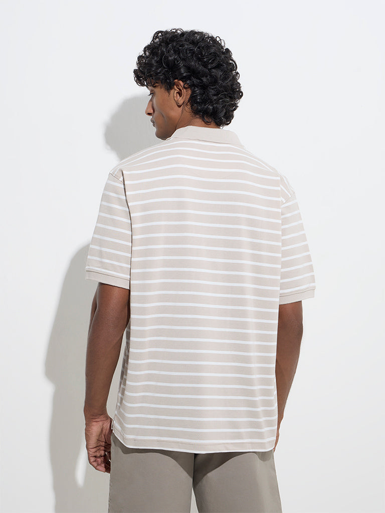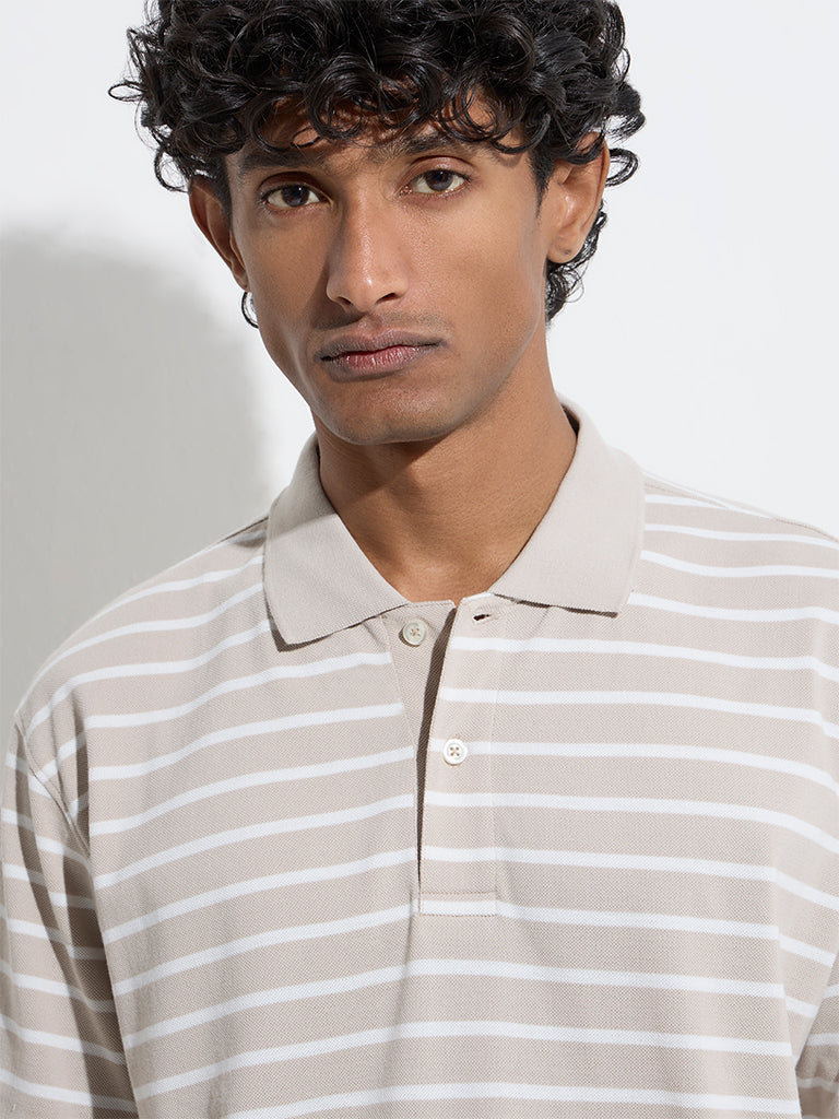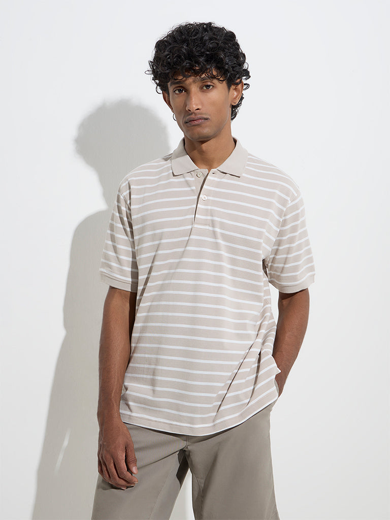 This beige polo t-shirt by WES Casuals showcases striped motifs in a relaxed silhouette. Crafted from a cotton-blend fabric. it includes a spread collar. half sleeves. and a short button placket.