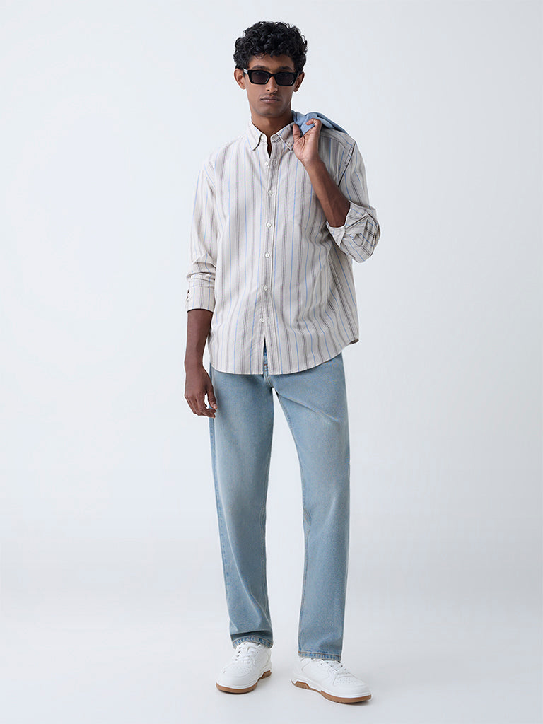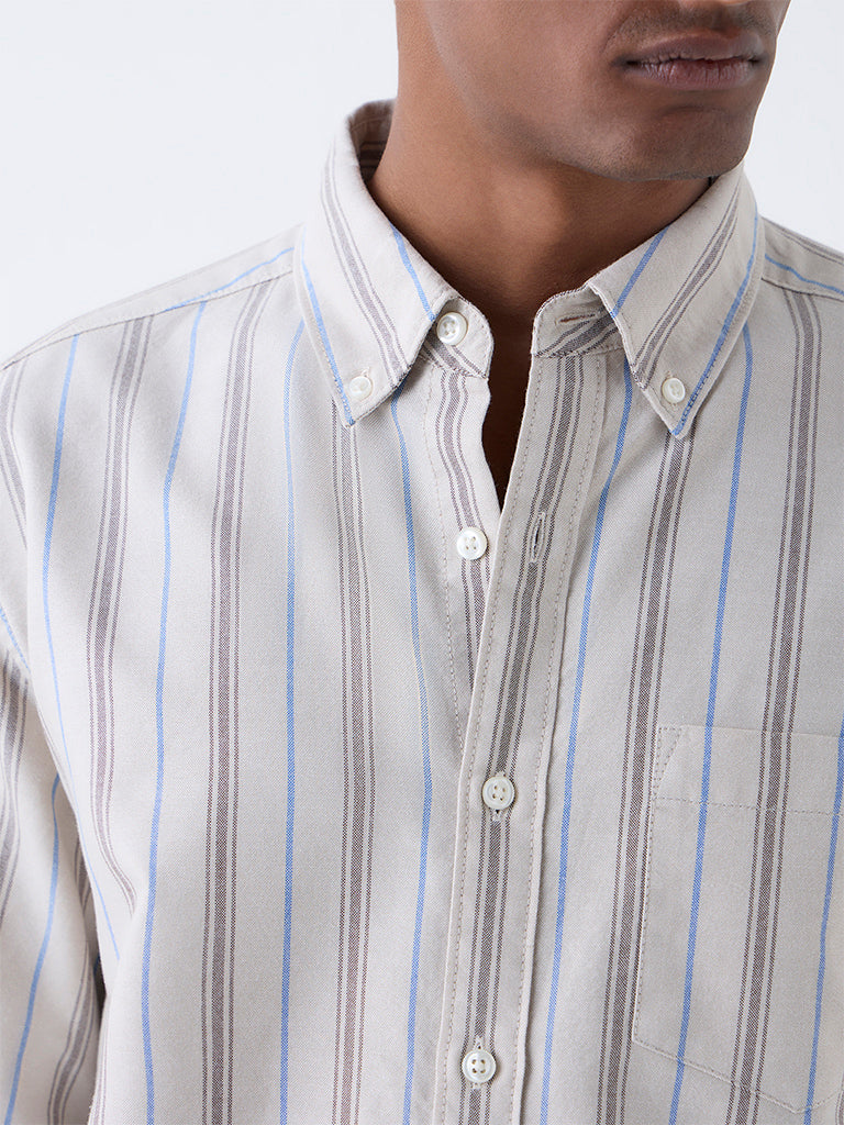 WES Casuals Beige Striped Relaxed-Fit Cotton Shirt