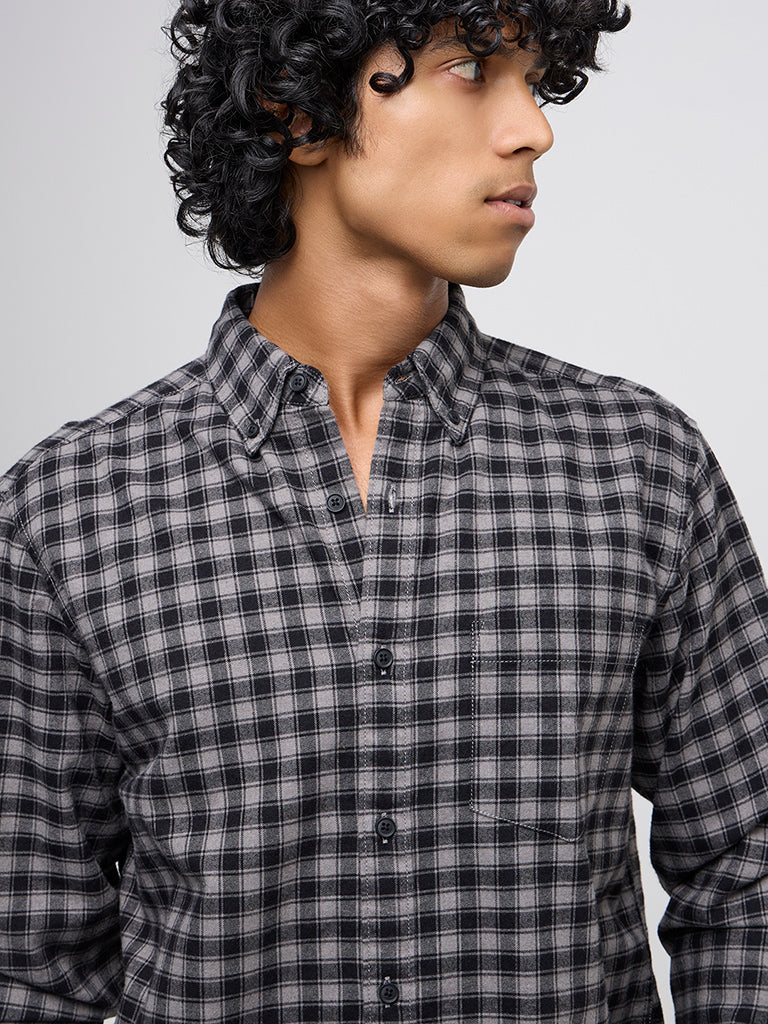 WES Casuals presents this black shirt with trendy checkered print. The relaxed-fit shirt comforts with its cotton-rich blend. It includes a buttoned collar. button down front. full sleeves and a front pocket.