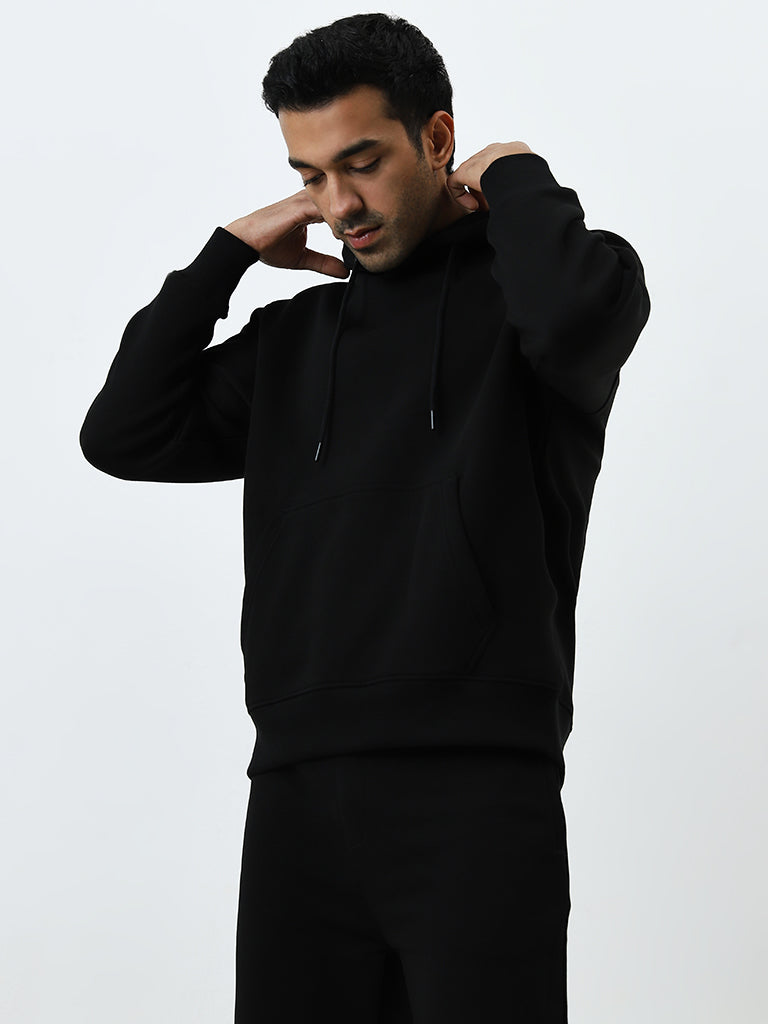 WES Casuals presents this black hoodie sweatshirt in a relaxed-fit. Made with soft and breathable fabric. it carries a an adjustable hoodie. full sleeves and a kangaroo pocket.