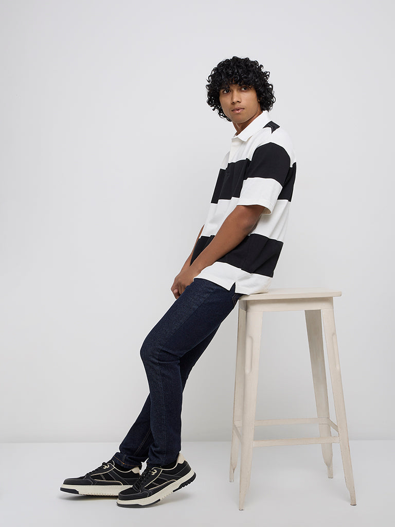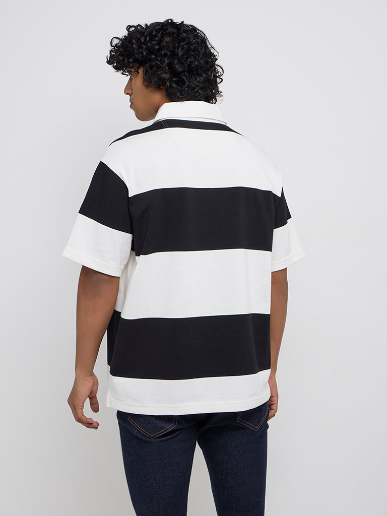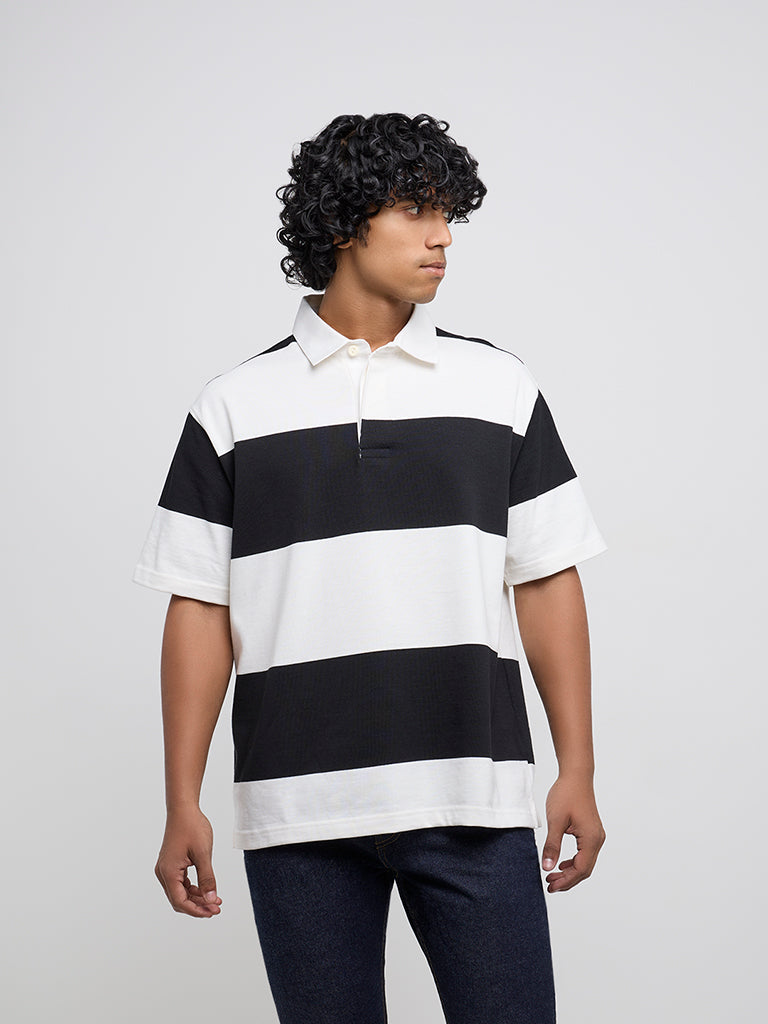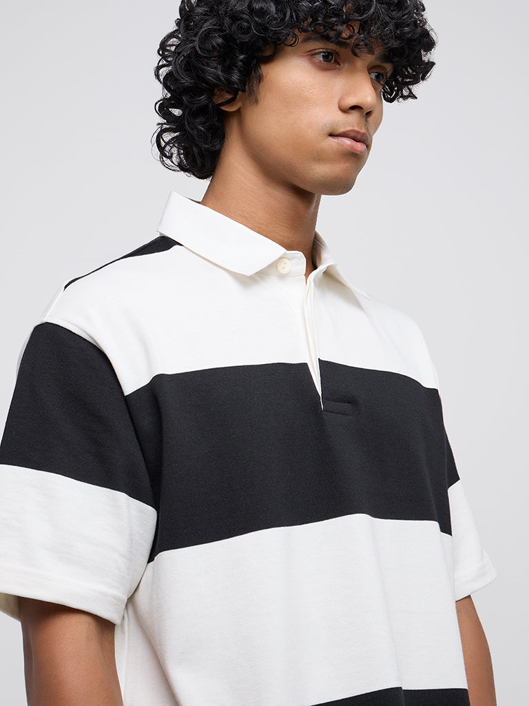 WES Casuals Black Striped Relaxed-Fit Cotton-Blend Polo T-Shirt
