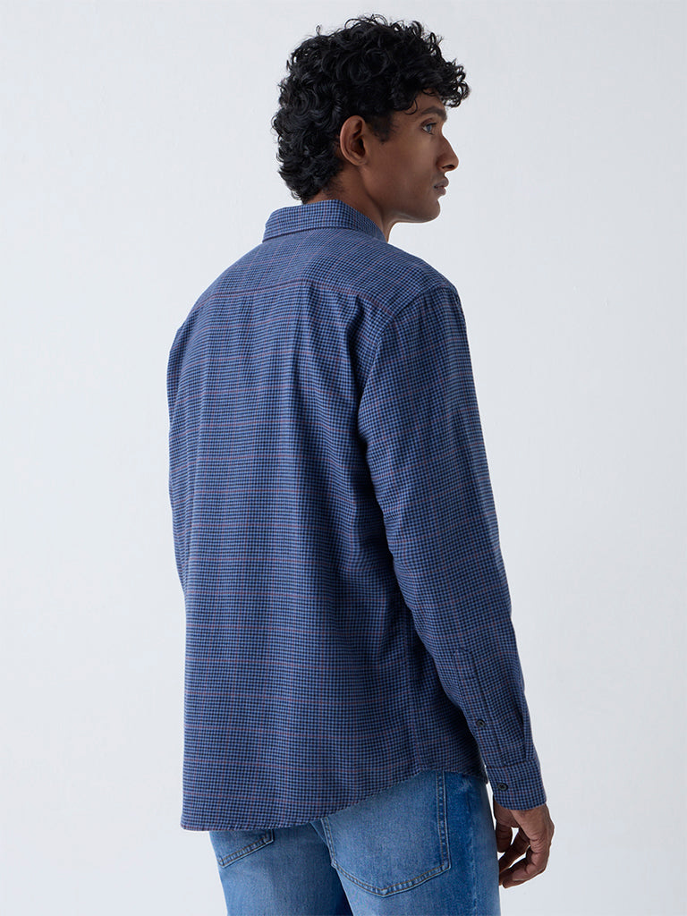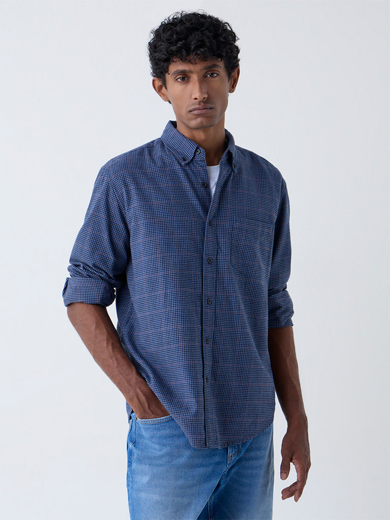 WES Casuals Blue Checks Detailed Relaxed-Fit Cotton Shirt