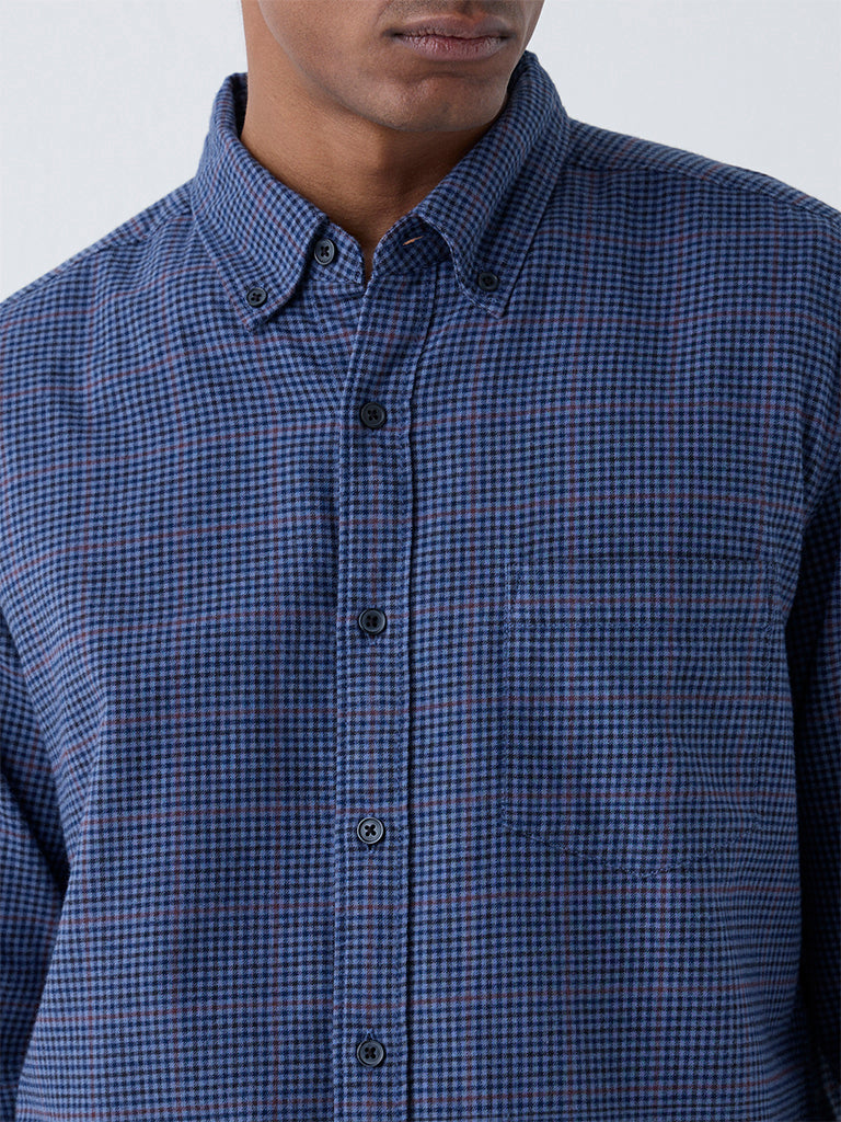 WES Casuals introduces this blue shirt featuring check patterns for an elevated casual appeal. It is framed with a button-down collar. full sleeves and a front pocket for a functional detail. Sculpted in a relaxed frame from a lightweight fabric. it ensures comfort while keeping the look polished for everyday wear.