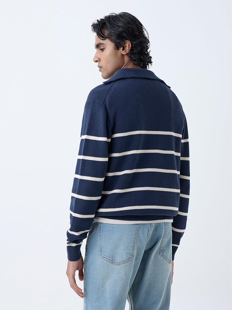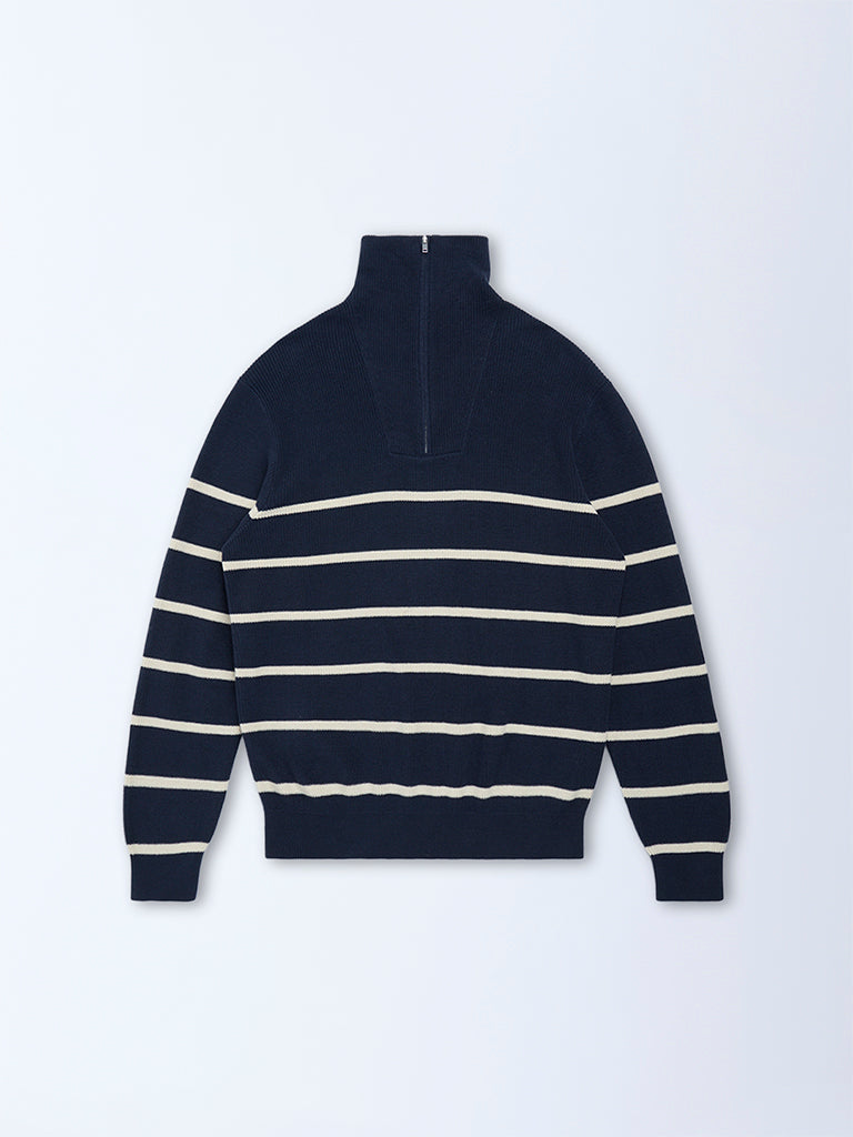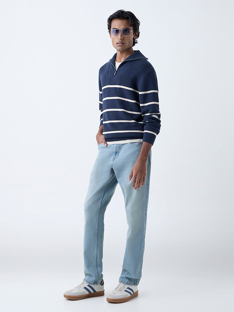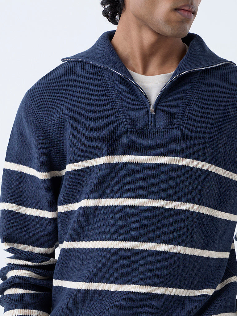 Settle into winter with this blue sweater from WES Casuals. milled from pure cotton for lasting softness. The relaxed fit and high neck with a zip closure lock in warmth. while full sleeves and classic stripes lend a laid-back yet polished vibe. The perfect piece for chilly mornings and cosy evenings alike.