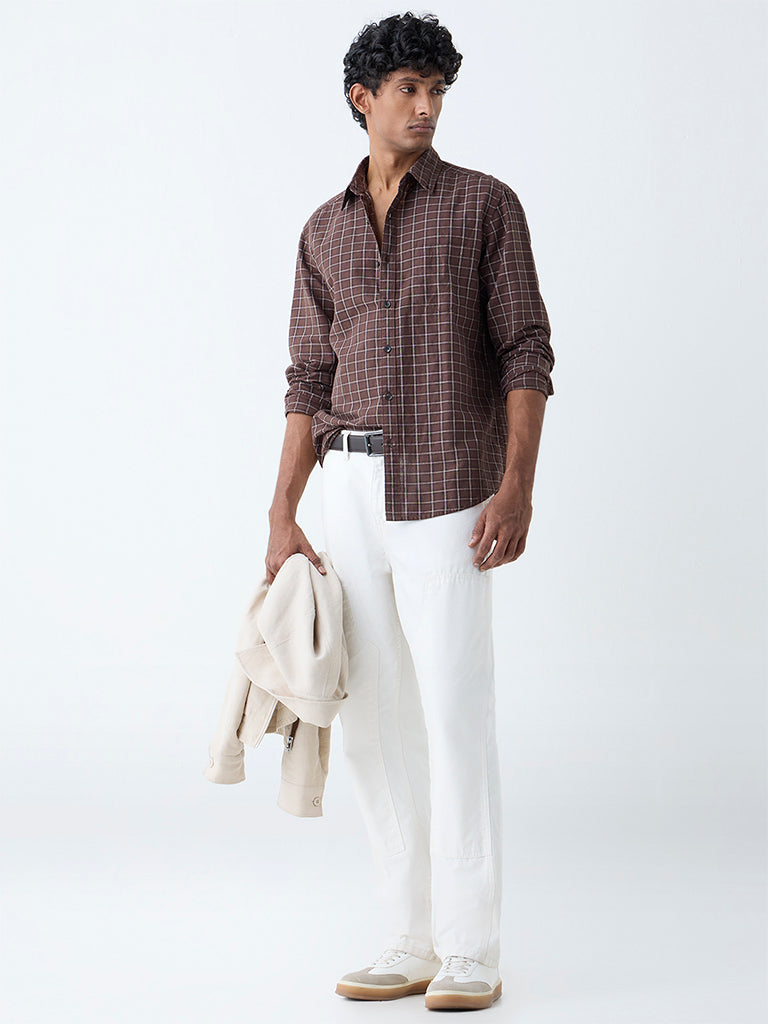 WES Casuals Brown Checkered Relaxed-Fit Cotton-Blend Shirt