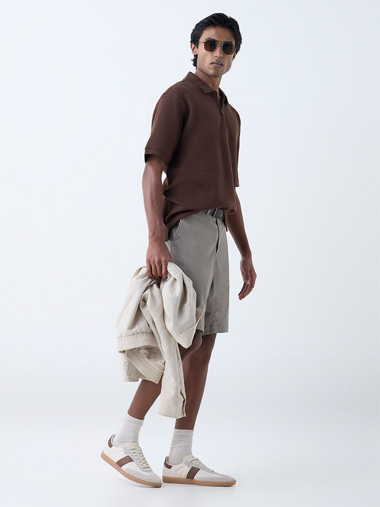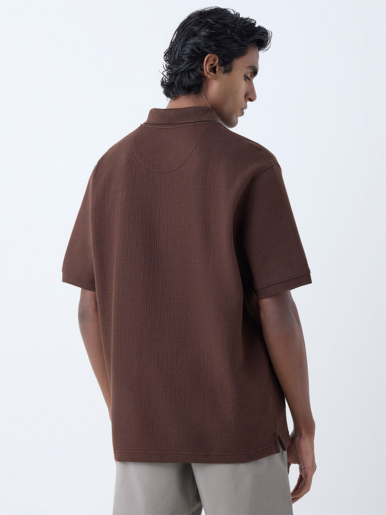 Step up your weekend game with this brown polo t-shirt from WES Casuals. Shaped in a relaxed fit from a self-textured fabric. it’s accented with a sleek zipper placket. classic collar and short sleeves for a modern twist on a timeless staple.