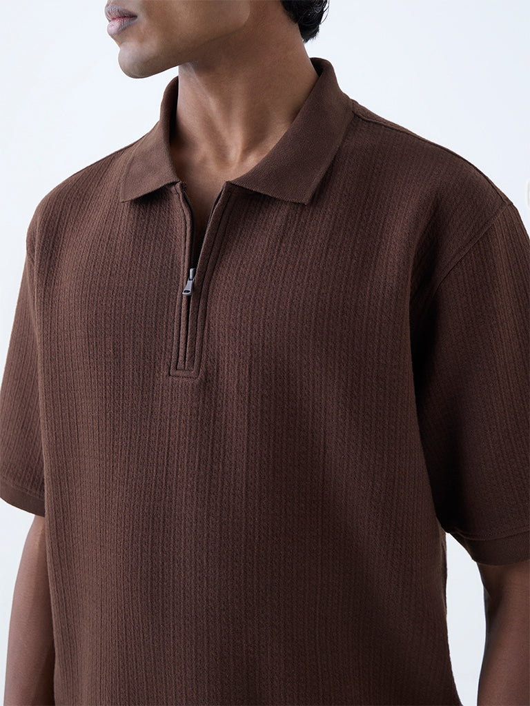 WES Casuals Brown Relaxed-Fit Quarter-Zip Cotton-Blend Polo T-Shirt