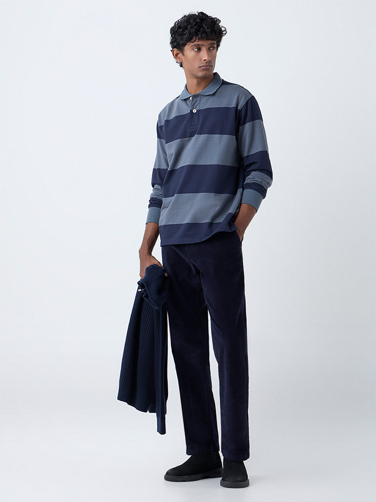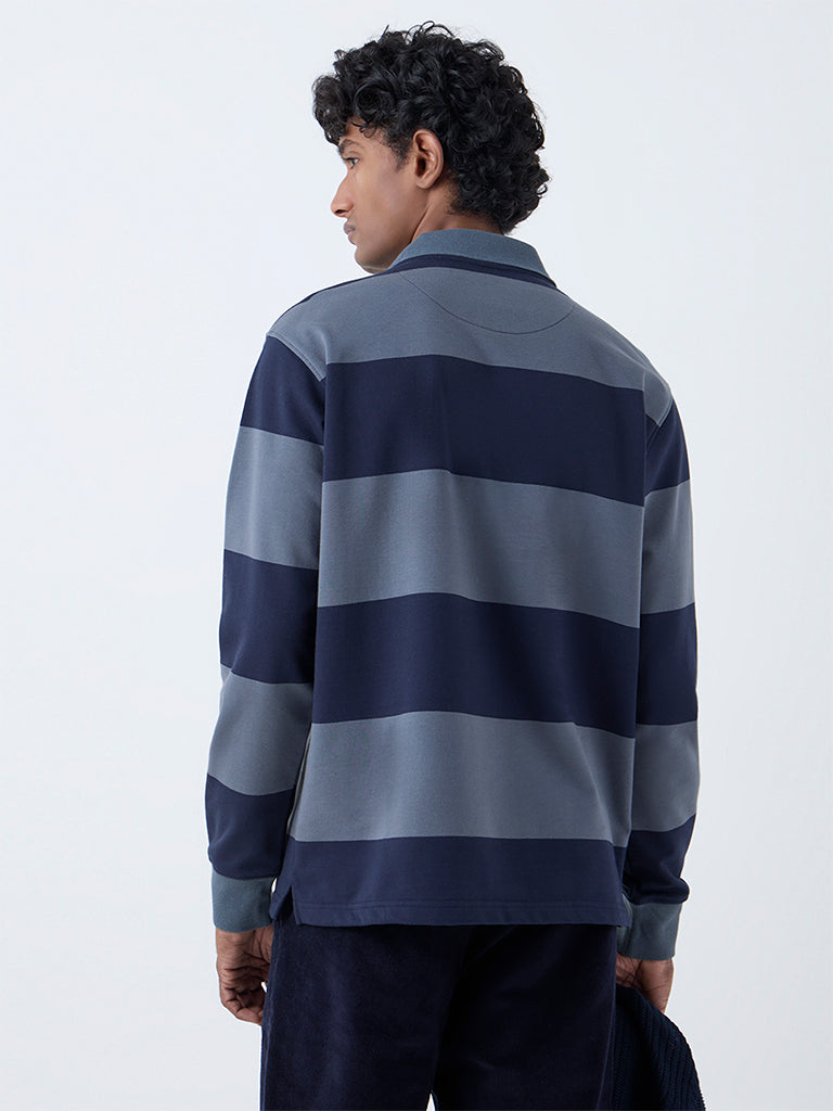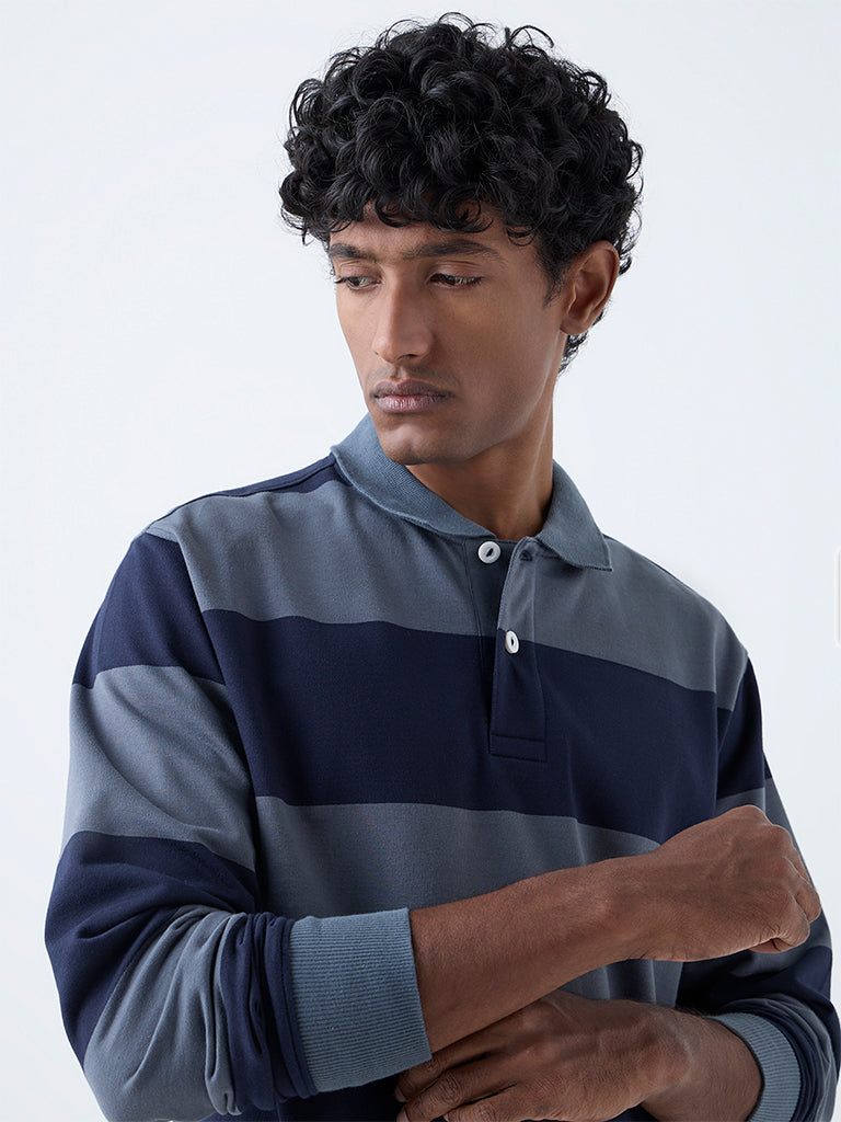 WES Casuals Dark Blue Striped Relaxed Fit Cotton-Blend Polo T-Shirt