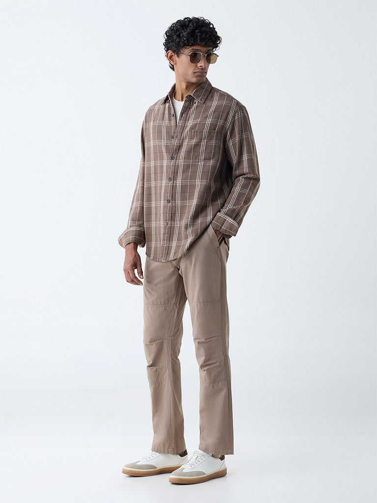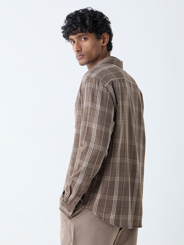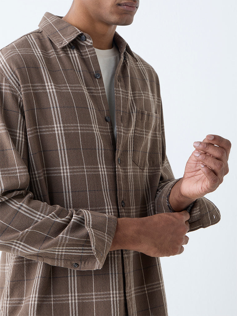 WES Casuals Dark Brown Checks Relaxed-Fit Cotton Shirt