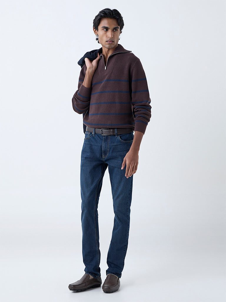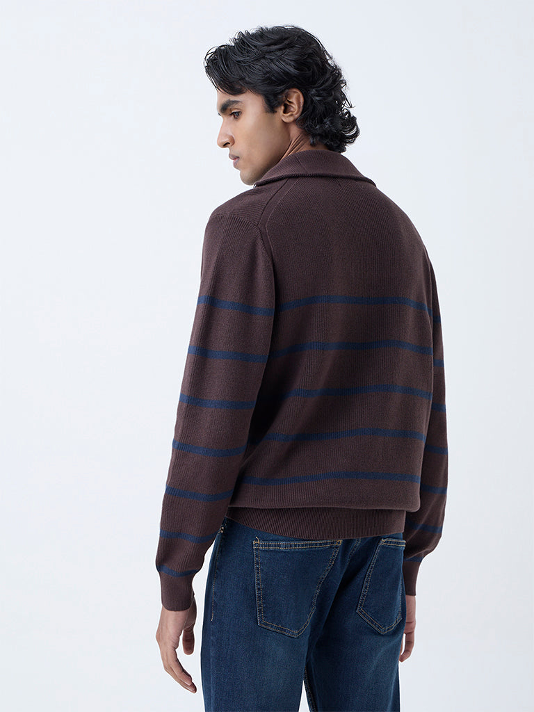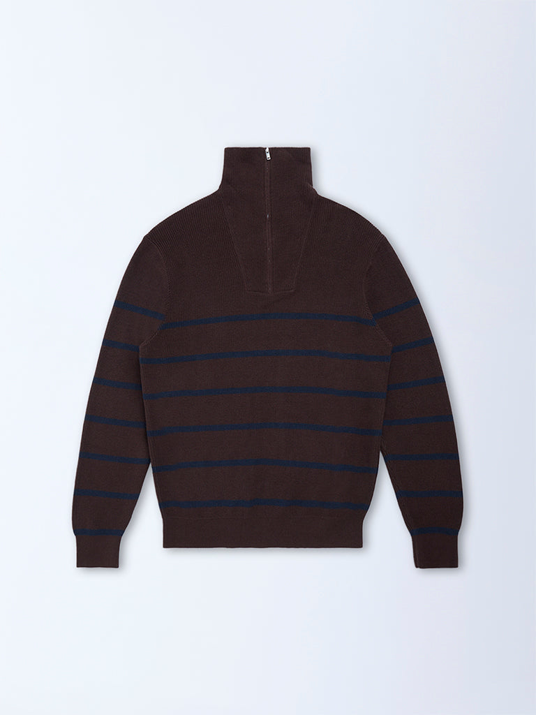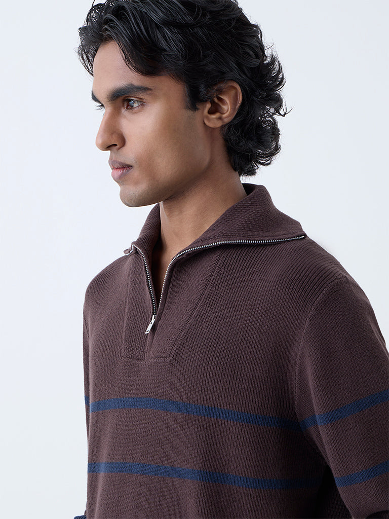 Embrace the season in comfort with this dark brown sweater by WES Casuals. Woven in pure cotton and tailored to a relaxed silhouette. it features a striped design. high neck with a zipline. and full sleeves. An easy layer for crisp winter days. it brings a touch of casual sophistication to your cold-weather line-up.