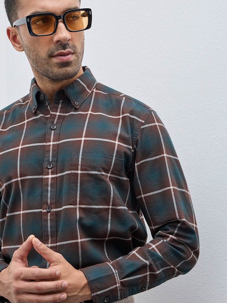 This dark green shirt from WES Casuals is defined with checkered designs. Made from a lightweight fabric in a relaxed profile. it is designed with a smart button-down collar which extends to a button placket and full sleeves.