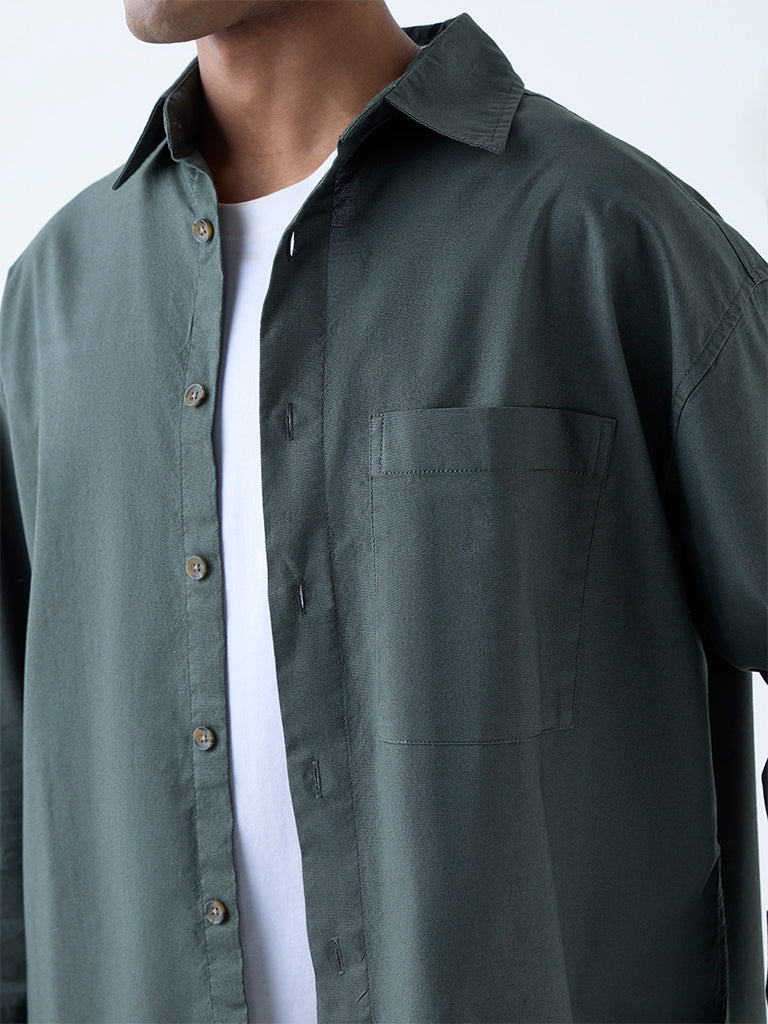 WES Casuals Dark Green Solid Relaxed-Fit Cotton Shirt