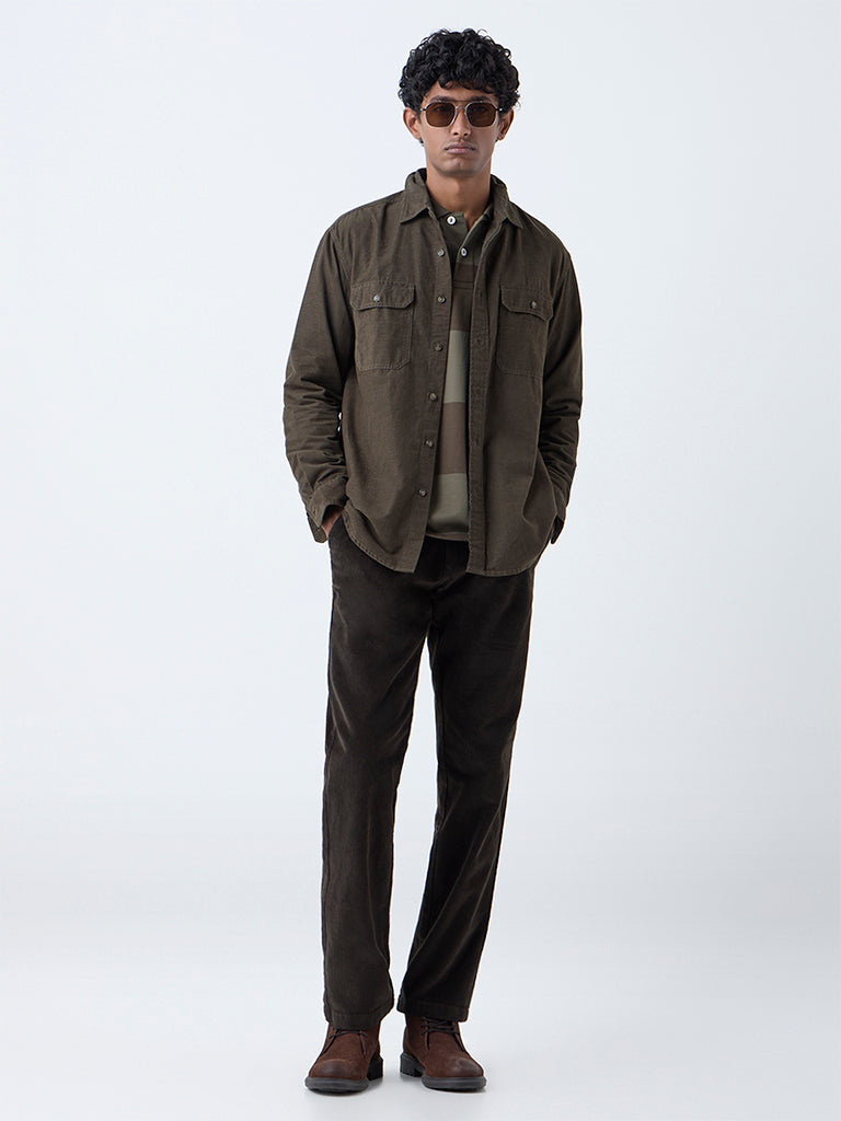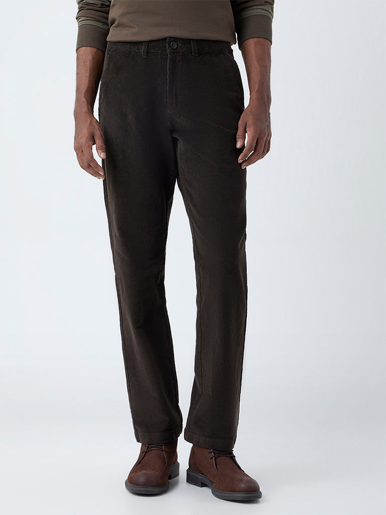 WES Casuals Dark Olive Relaxed Fit Mid-Rise Corduroy Chinos