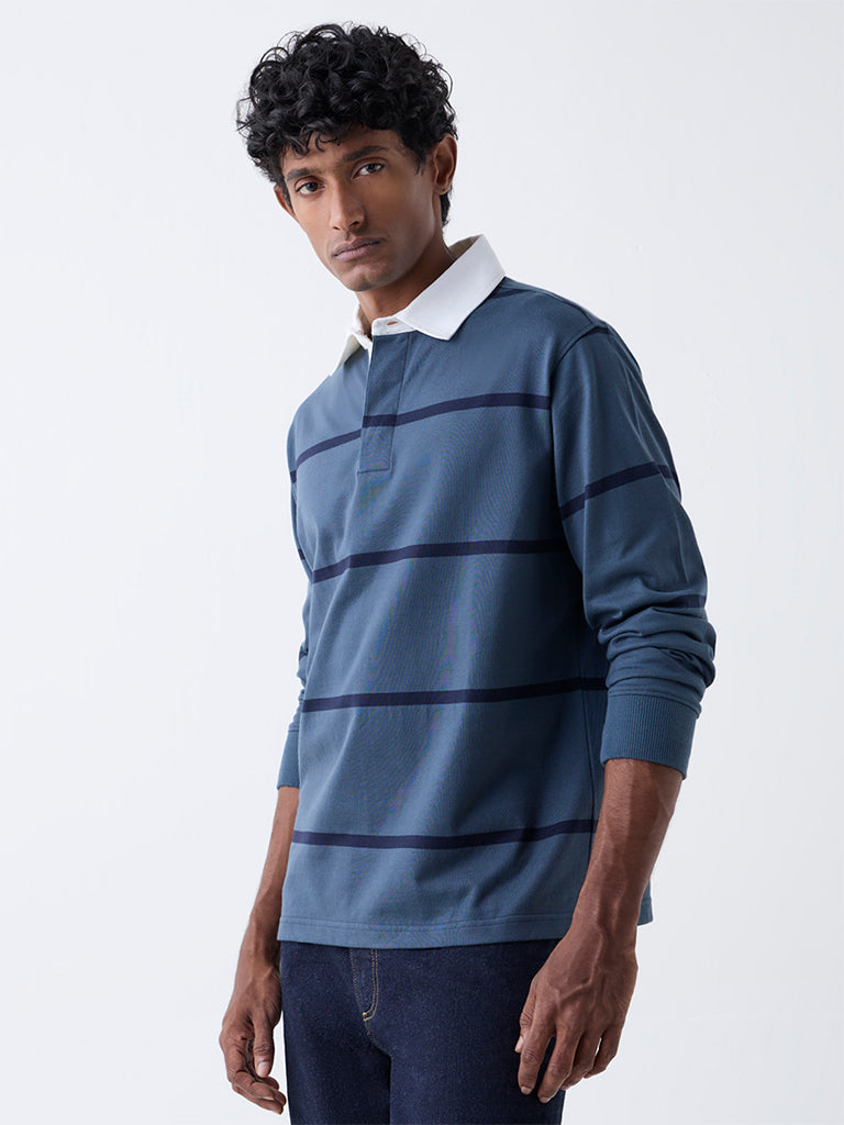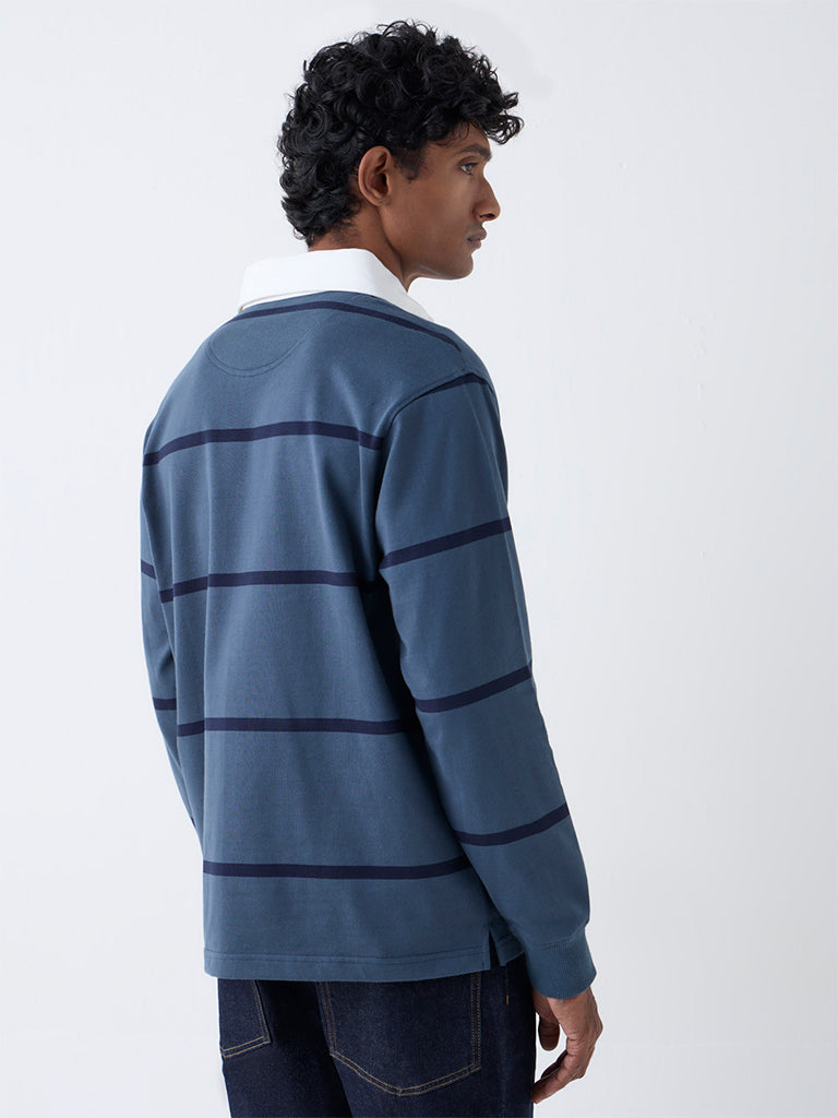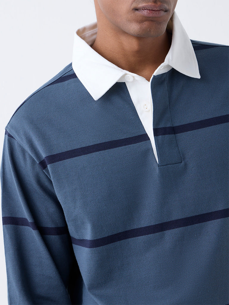 WES Casuals Dusty Blue Striped Relaxed Fit Cotton-Blend Polo T-Shirt
