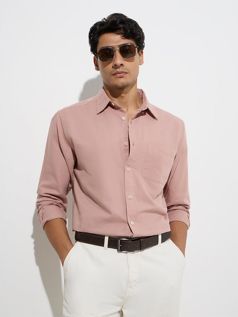 This dusty pink shirt from WES Casuals is a fresh addition to your everyday rotation. defined by its relaxed silhouette and solid design. Milled from a premium linen-blend fabric for easy comfort. it features a classic collar. full sleeves. a button placket. and a chest pocket.