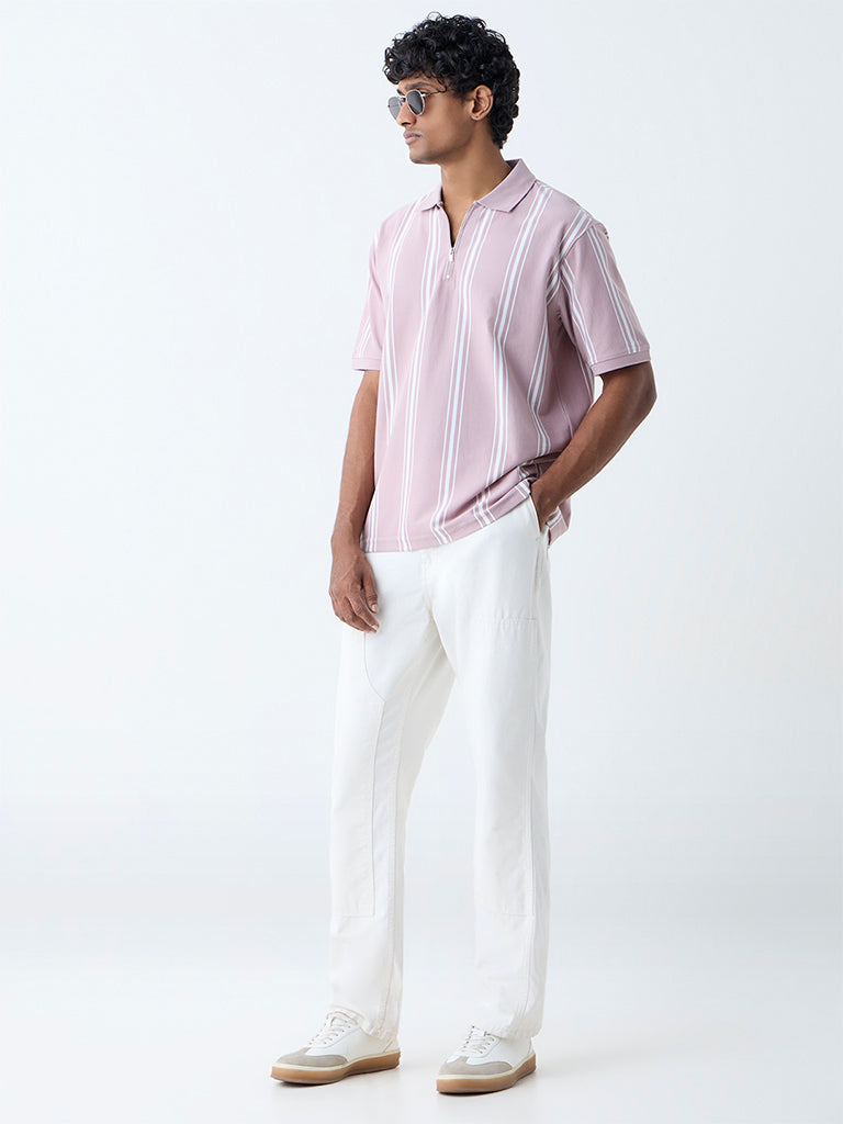 WES Casuals Dusty Pink Striped Relaxed-Fit Polo T-Shirt