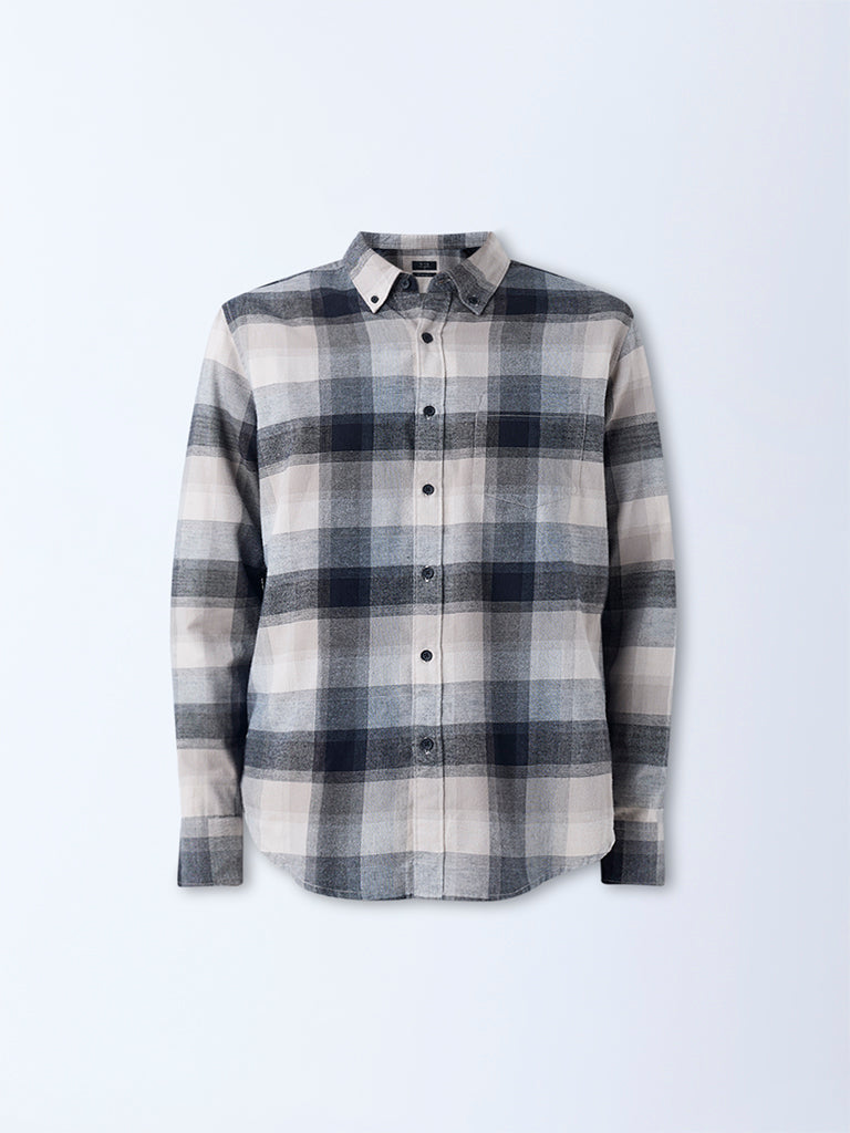 WES Casuals presents this grey shirt detailed with a button-down collar. full sleeves. and a functional front pocket. Showcasing classic check patterns across a relaxed silhouette. it brings a laid-back refinement to everyday wear. Woven from cotton-blend fabric. it offers a soft. comfortable feel that lasts through the day.