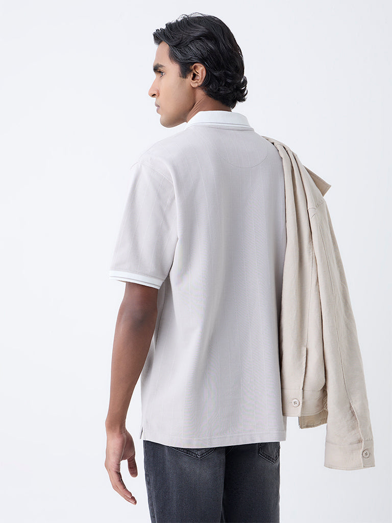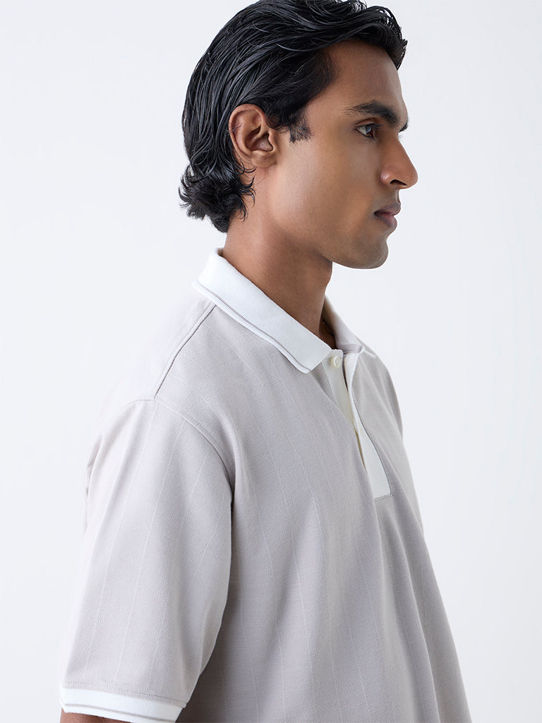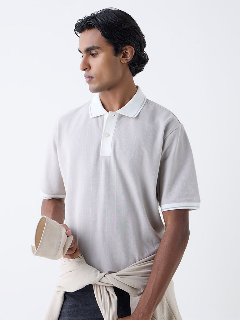 WES Casuals presents this grey polo t-shirt. exhibiting subtle stripes on a relaxed form. It is milled from a premium-blend fabric. providing everyday comfort. Carrying a contrast polo collar. a brief button placket and short sleeves. this piece offers a refined pick for warmer days.