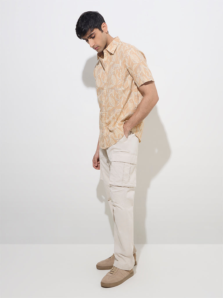 WES Casuals launches this light orange shirt. adorned with botanical prints for a refreshing touch. Crafted from pure cotton in a relaxed-fit silhouette. it features a spread collar. button-down front. half sleeves. and a front pocket for effortless casual styling.