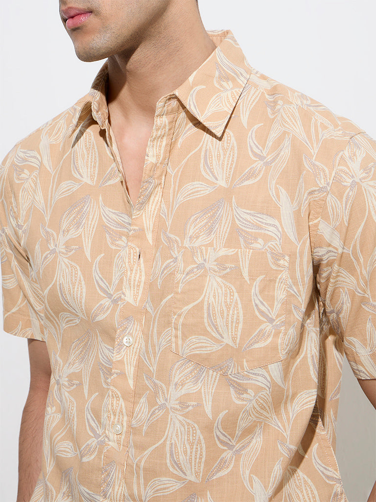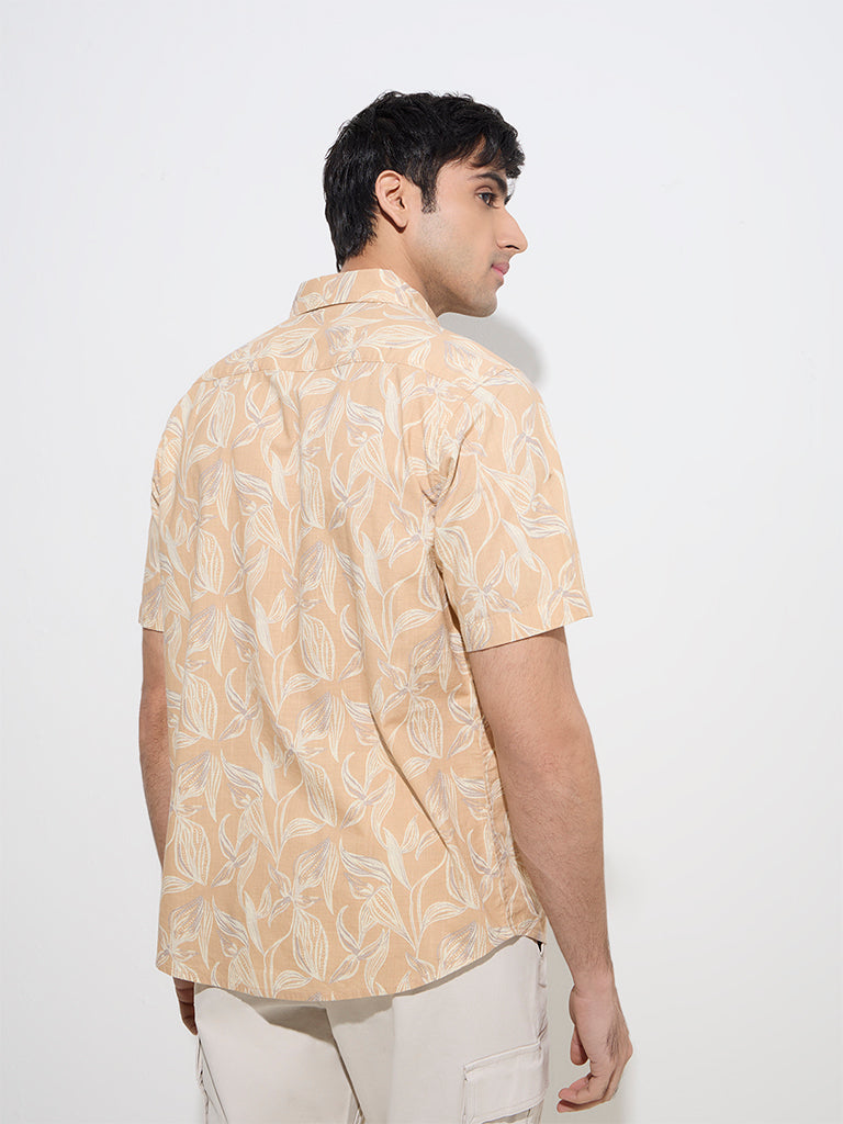 WES Casuals Light Orange Botanical-Printed Relaxed-Fit Cotton Shirt