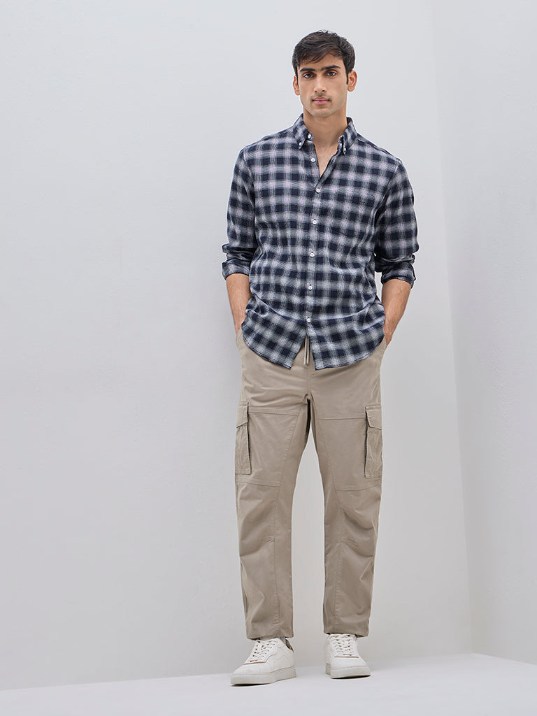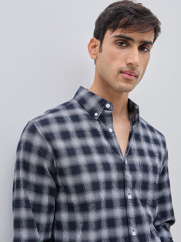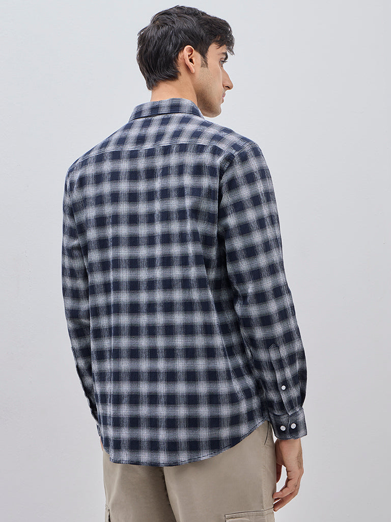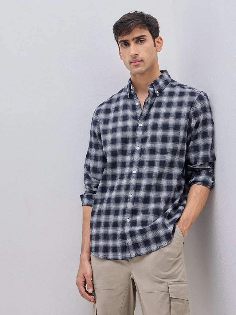 WES Casuals Navy Checkered Relaxed-Fit Cotton-Blend Shirt