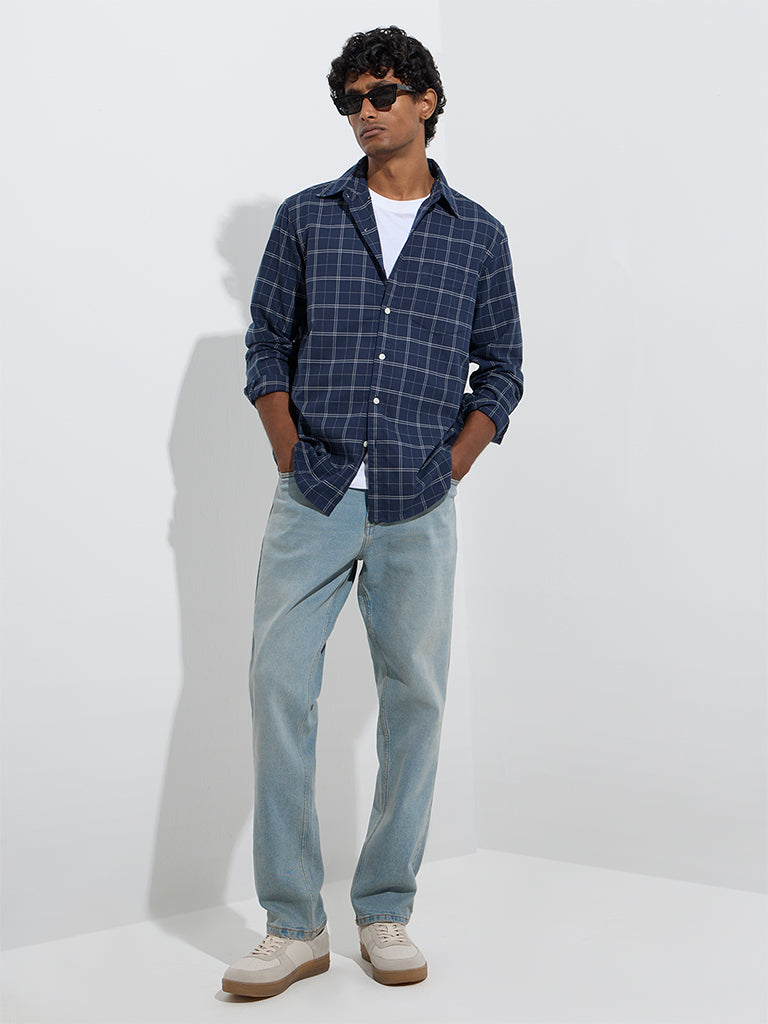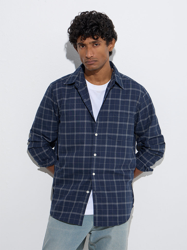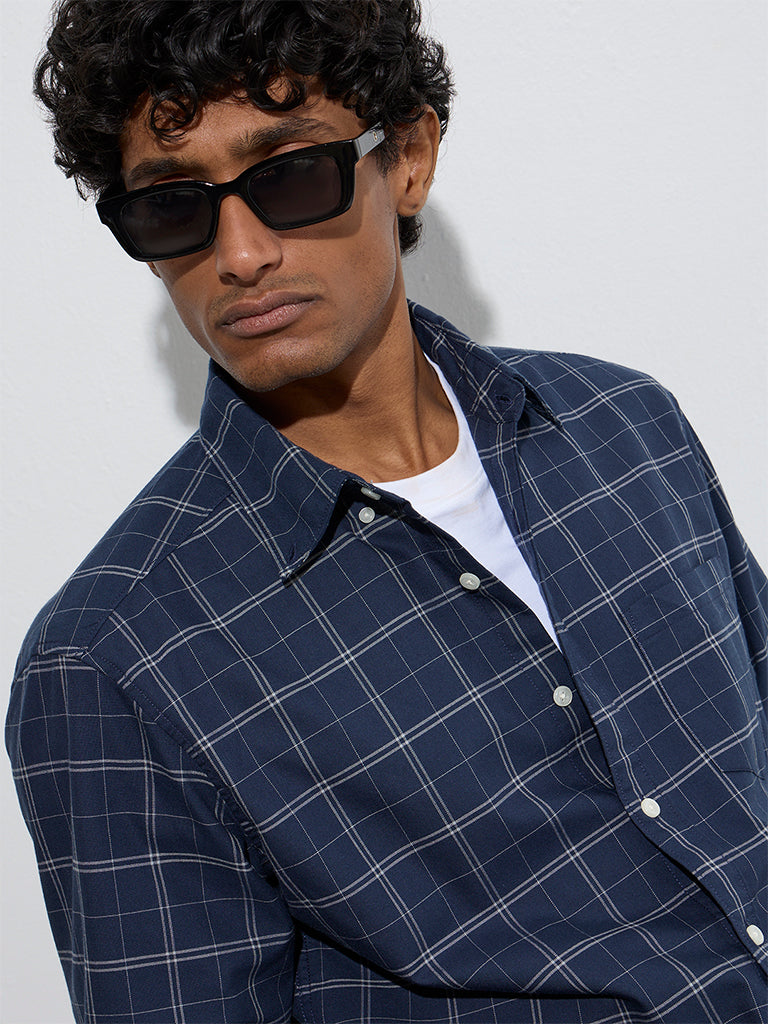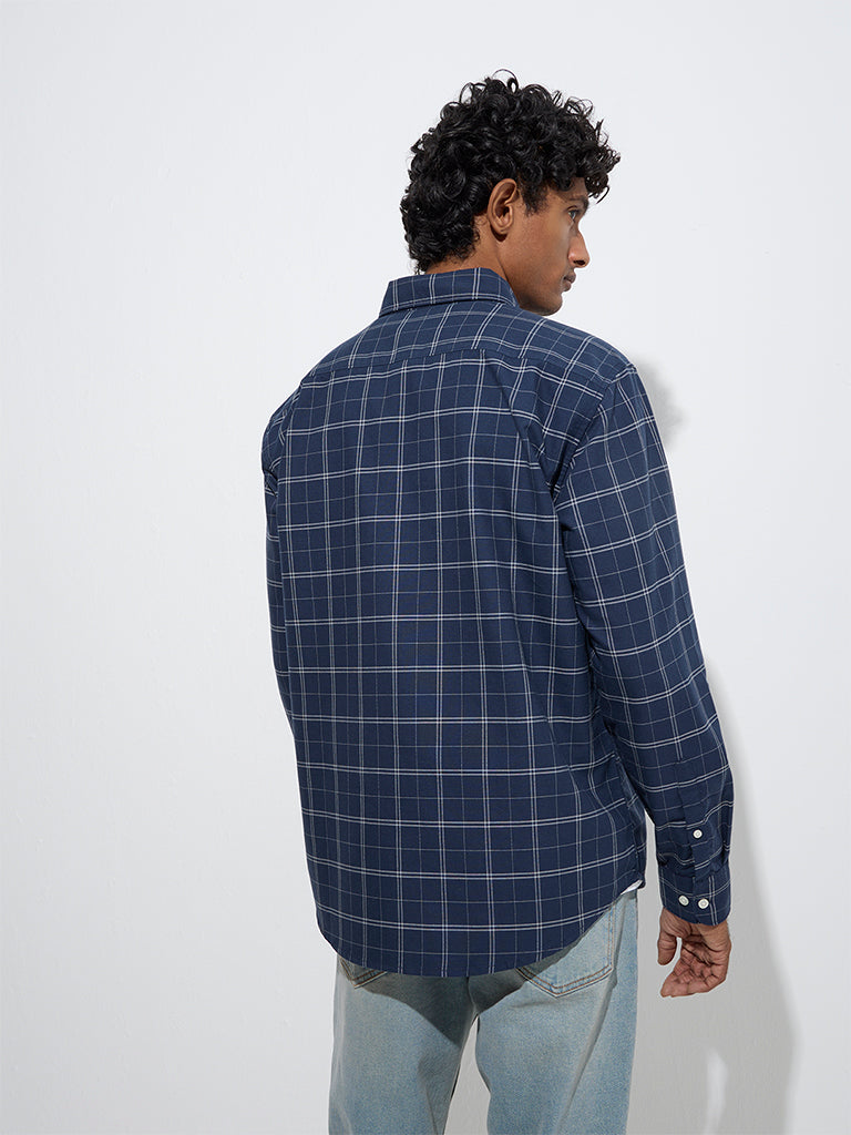 WES Casuals Navy Checks Design Relaxed-Fit Cotton Shirt