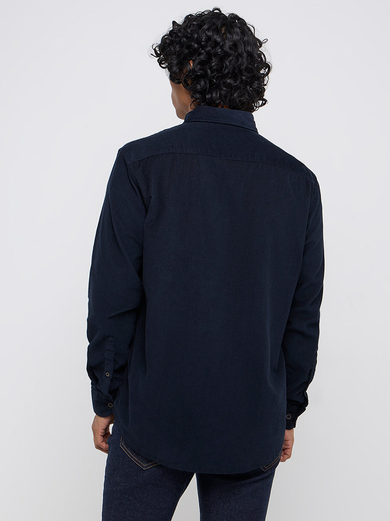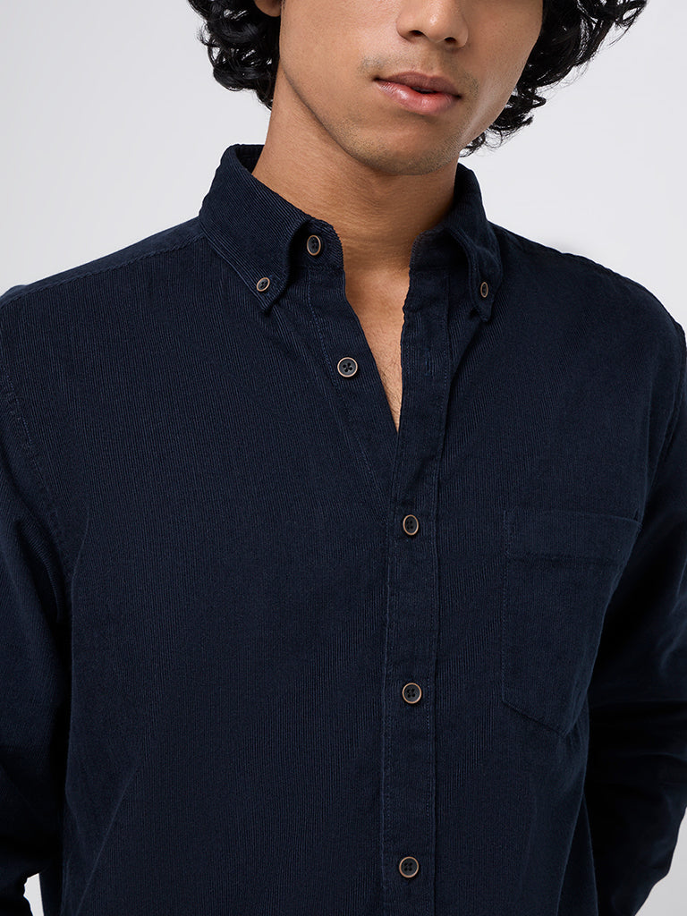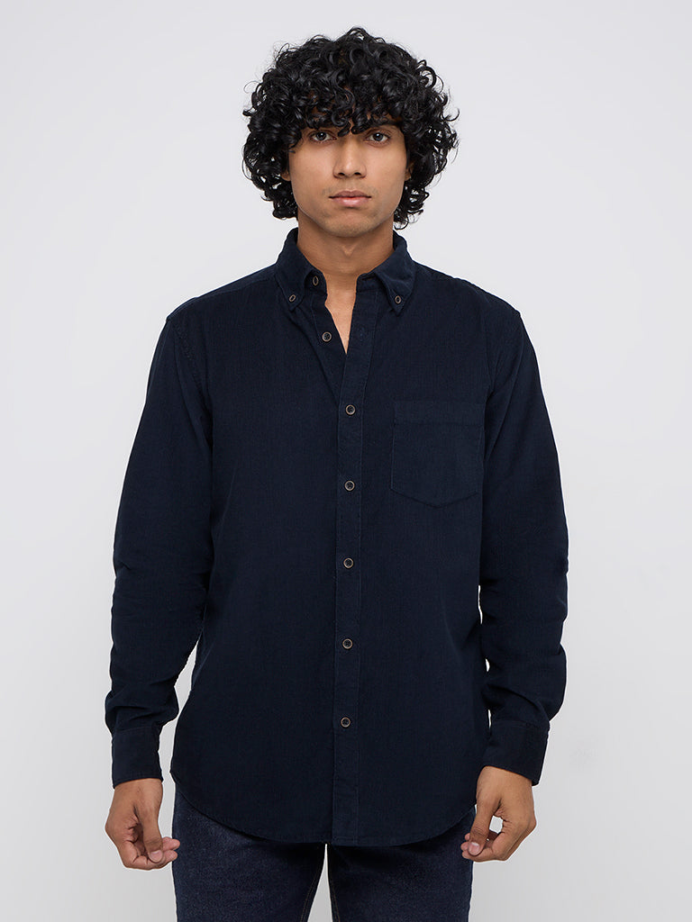 This navy shirt by WES Casuals offers a smooth corduroy texture. Made with pure cotton. the casualwear features a relaxed-fit frame through its buttoned collar. button down style. full sleeves and a front pocket.