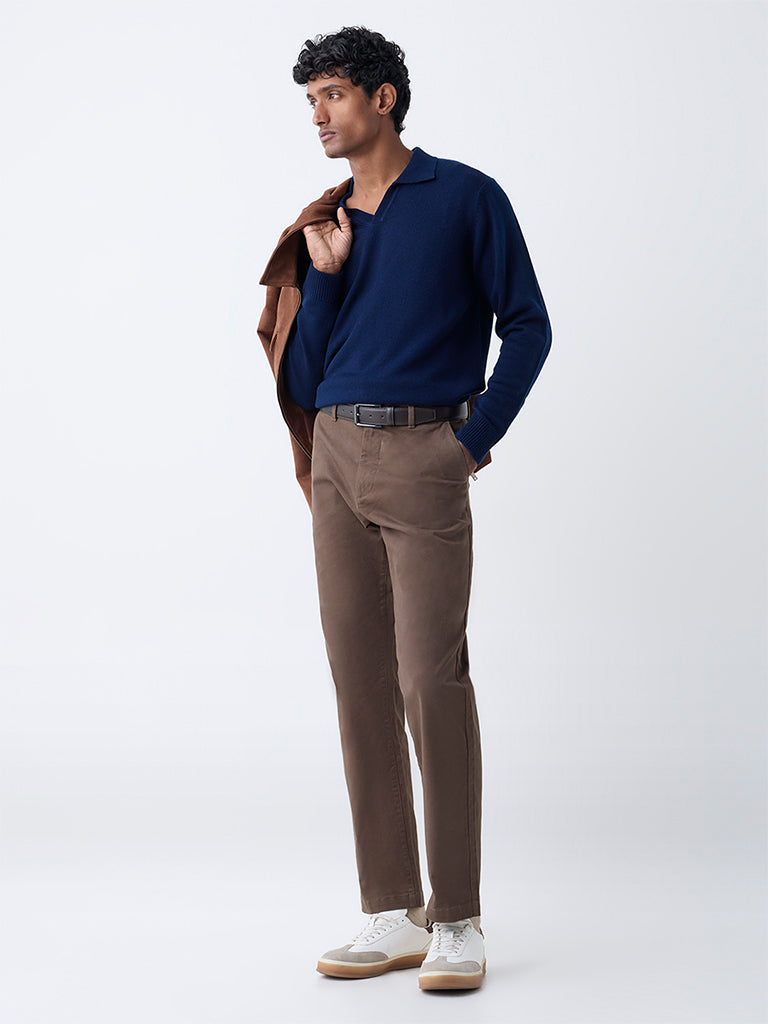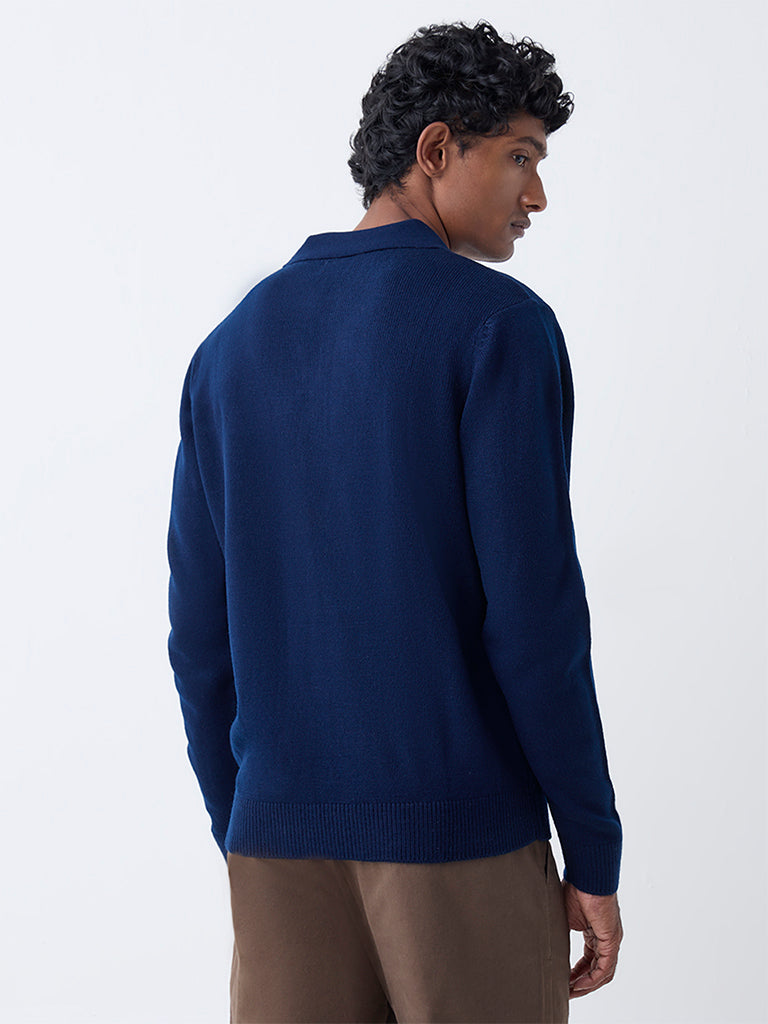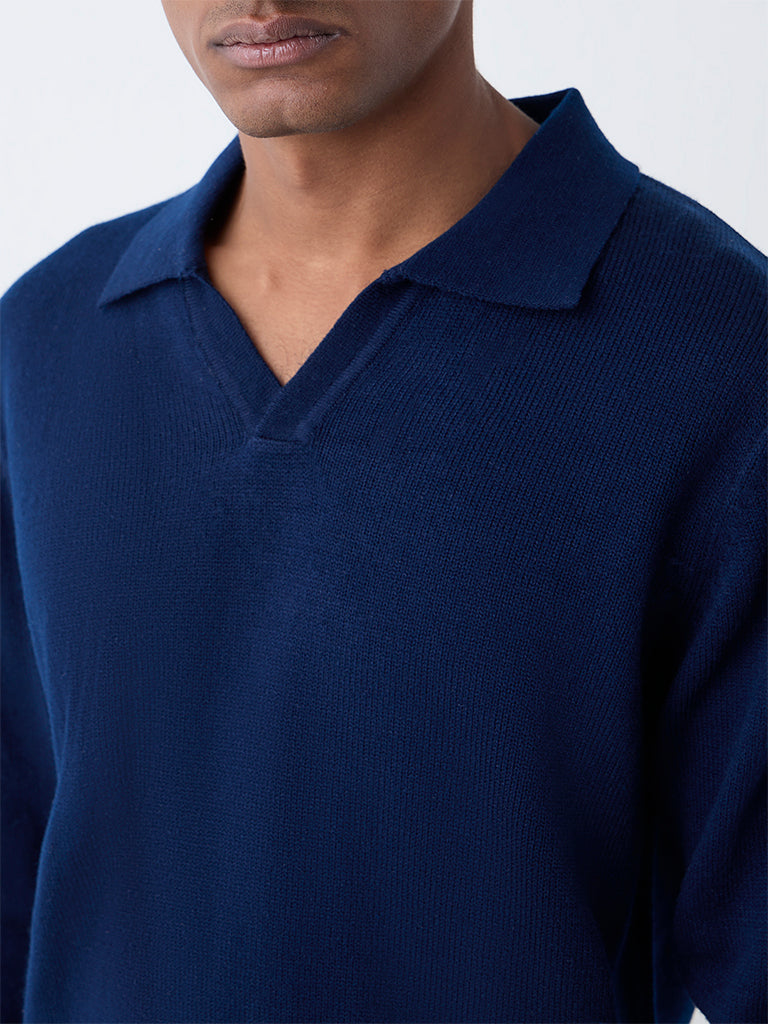 WES Casuals launches this navy sweater woven from a lightweight fabric. ensuring soft warmth and a soft feel. Framed in a relaxed-fit. it is styled with a spread collar and full sleeves. Serving as a smart layering option. this is refined essential for your winter wardrobe.