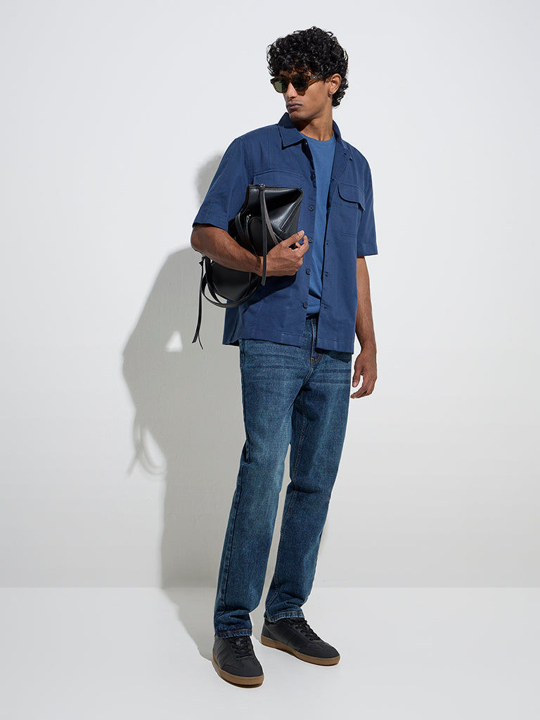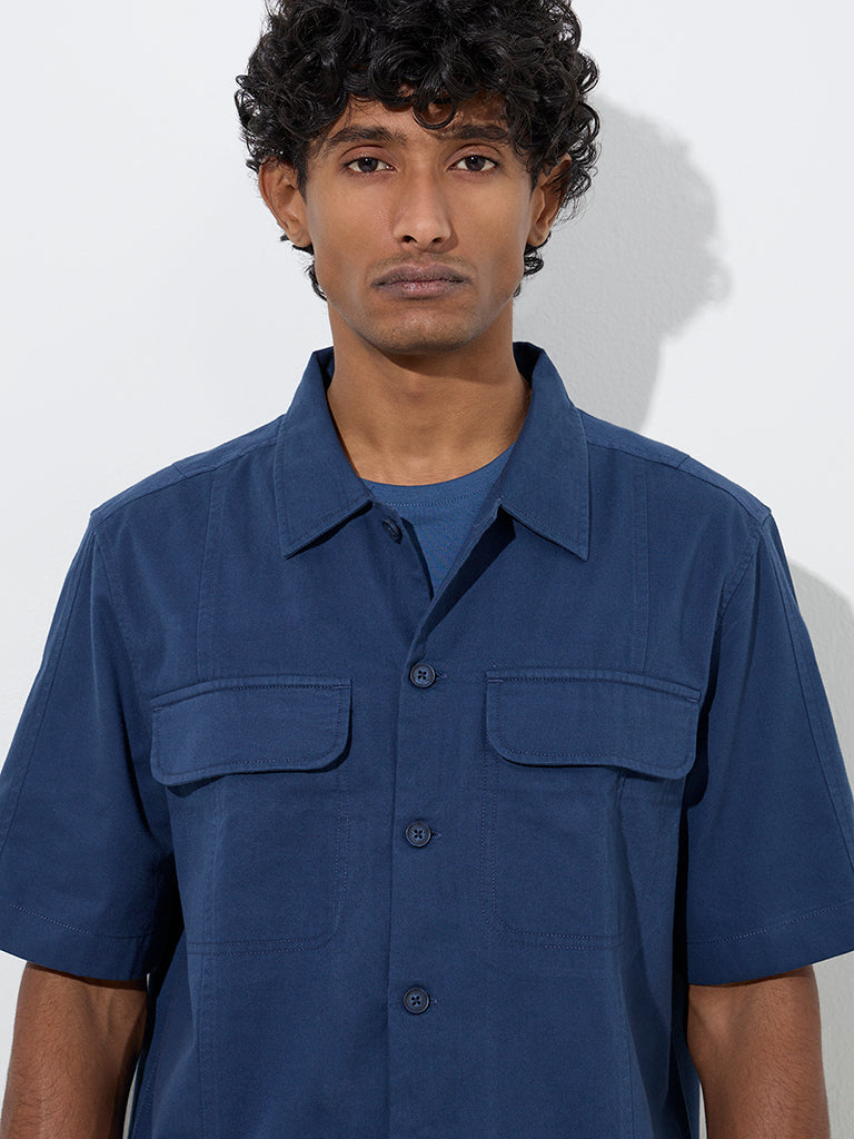 WES Casuals Navy Solid Relaxed-Fit Cotton Shirt