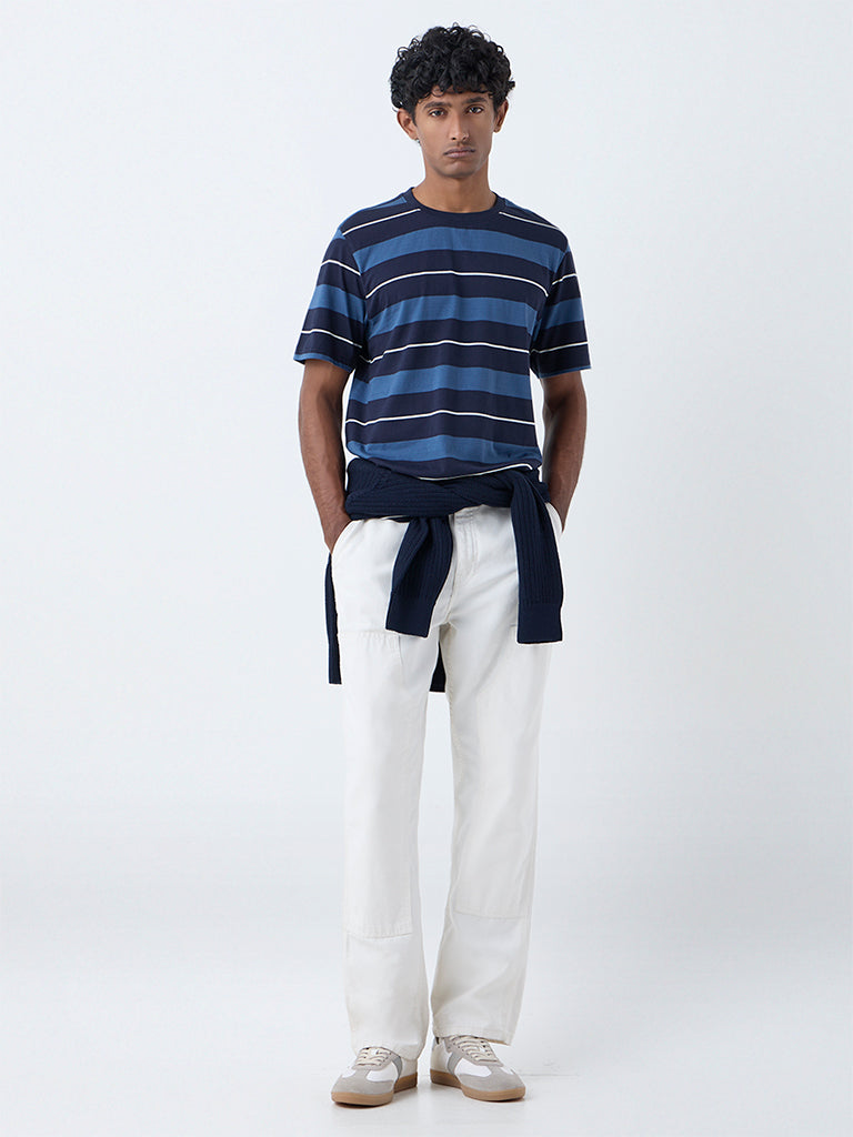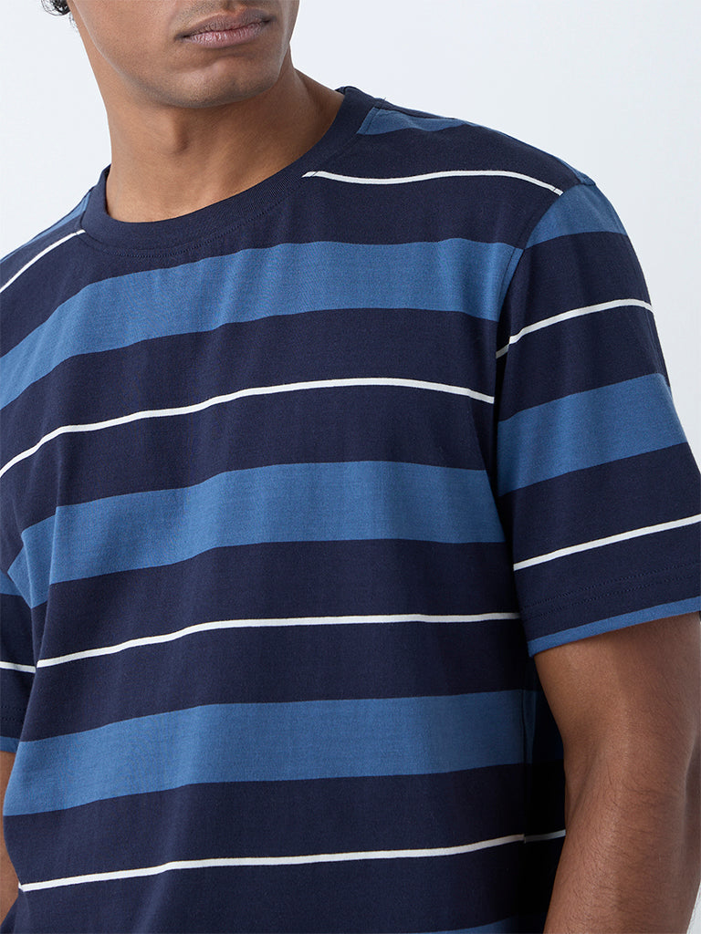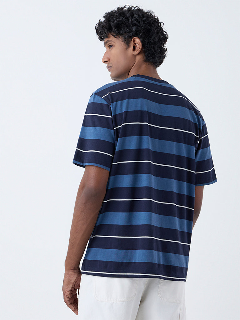 WES Casuals Navy Striped Relaxed Fit Cotton T-Shirt