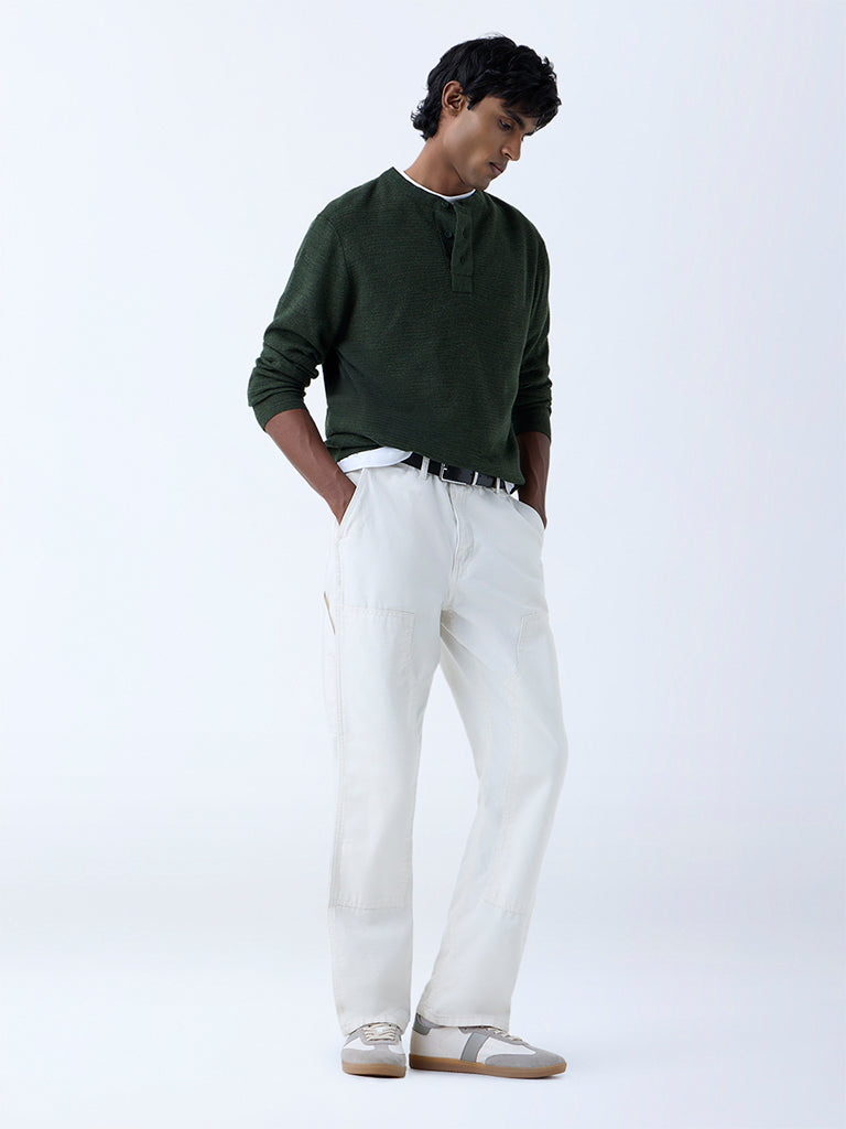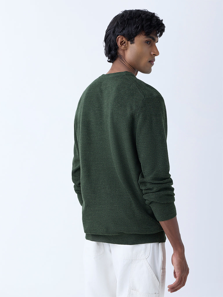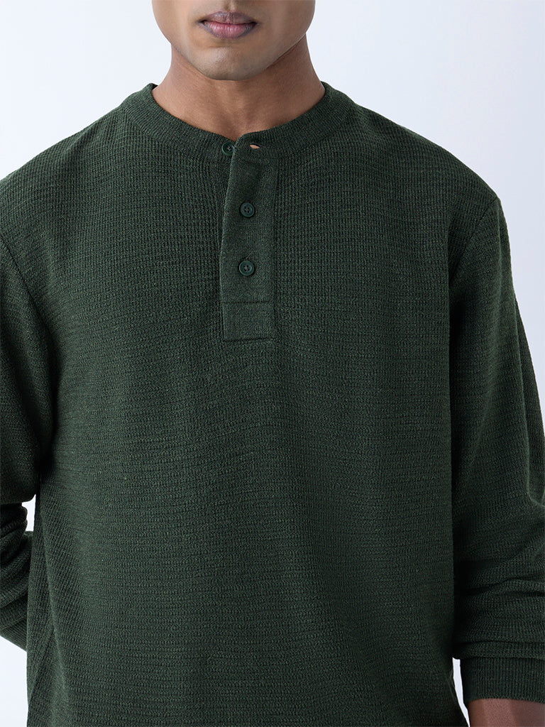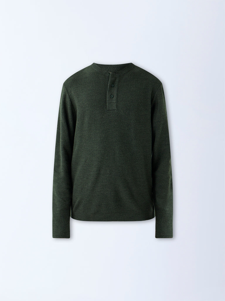 WES Casuals Olive Knitted Relaxed-Fit Henley Sweater