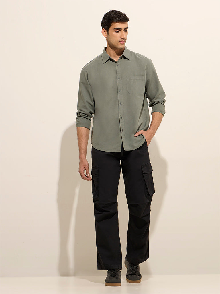 WES Casuals presents this suave shirt cut in a relaxed profile. Showcasing a olive colour. this breathable garment boasts a spread collar with a button placket and a chest pocket for added functionality.